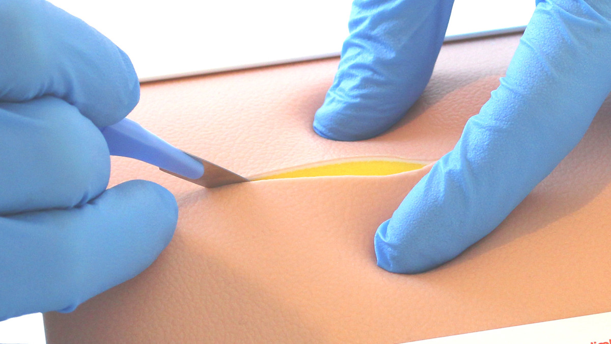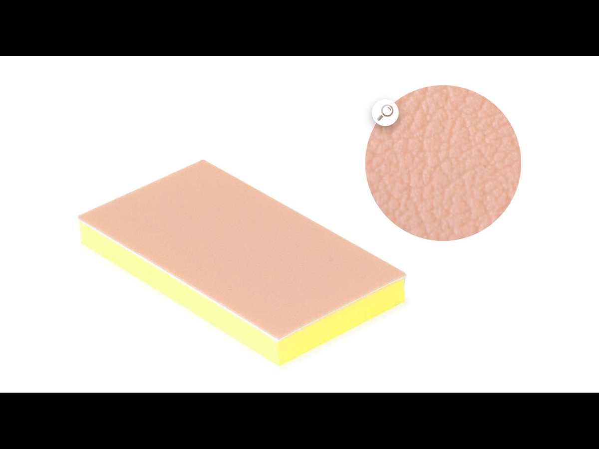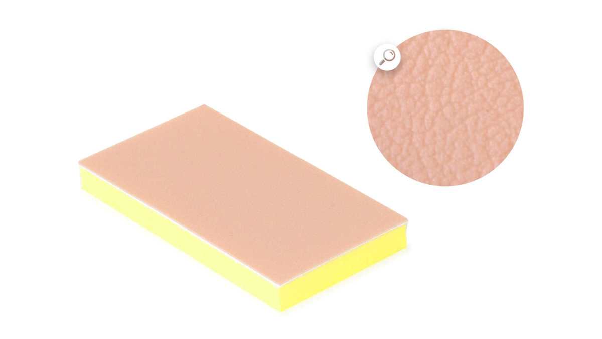 En avancerad huddyna med tre lager för demonstration och övning av olika typer av snitt och en mängd olika suturtekniker. Mörk hudton och stora dynor finns också tillgängliga.