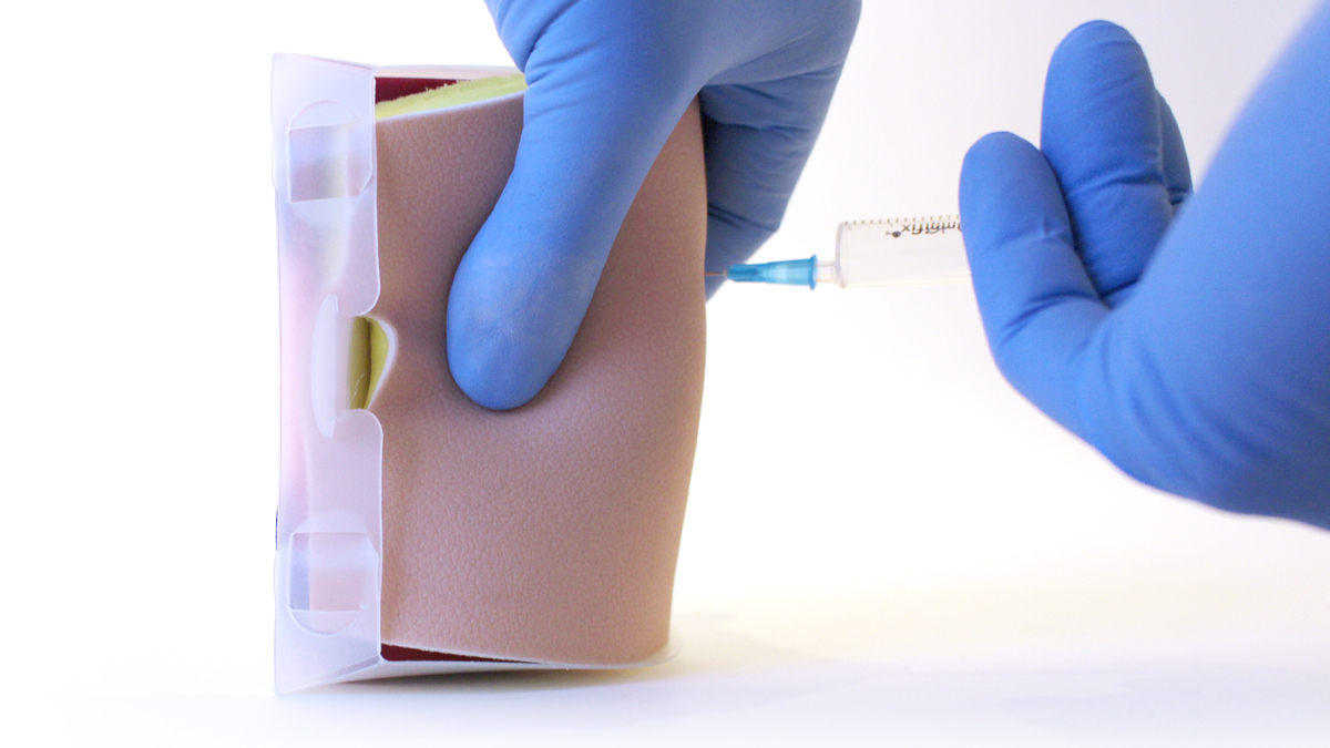 The trainer features realistic and easily identifiable tissue layers that represent the epidermis, dermis, adipose, and muscle. The receptive anatomical layers make this an ideal tool for teaching correct needle positioning to beginners and more clinically experienced individuals.