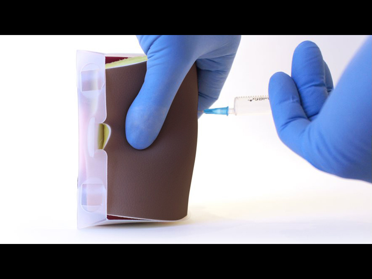 The fluid-absorbent skin pad allows learners to experience repeatable and realistic subcutaneous and intramuscular injections.