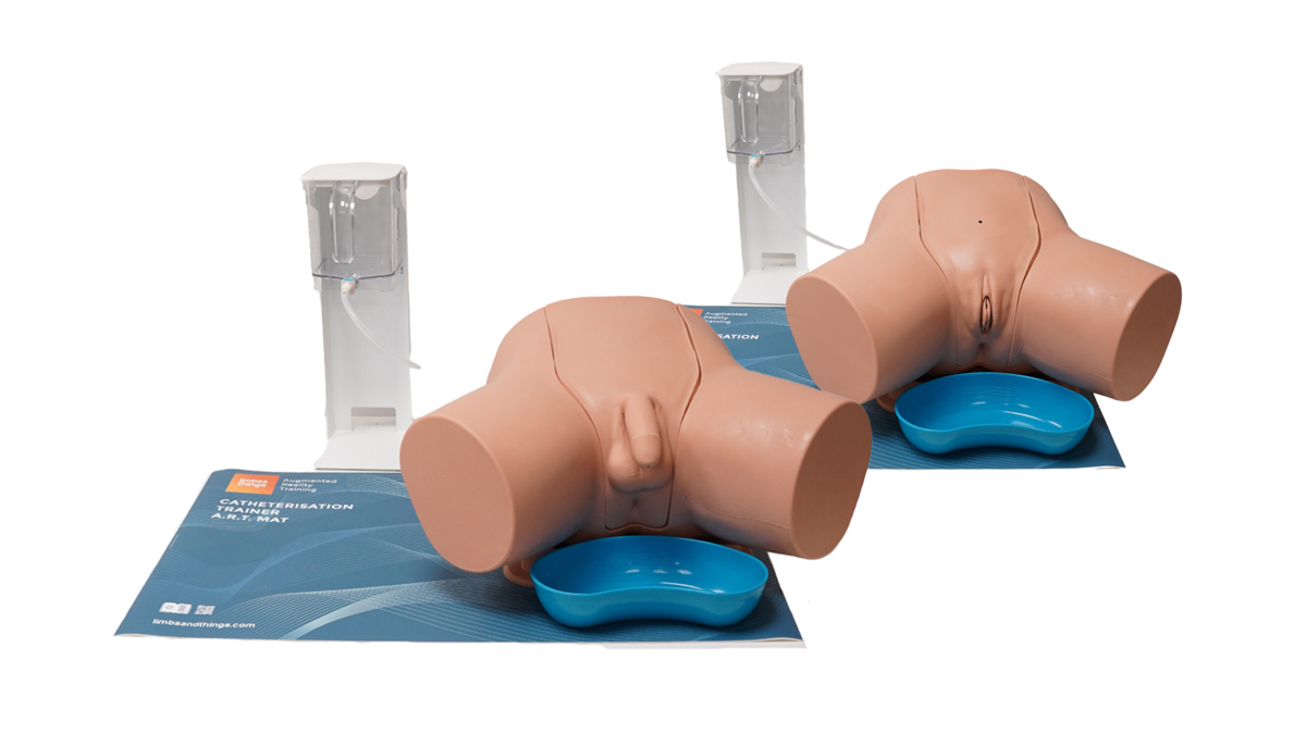 Advanced set includes a full Male Catheterisation model, and a full Female Catheterisation model. Each trainer comes with a complete set of parts, consumables, and Augmented Reality Training Mat.