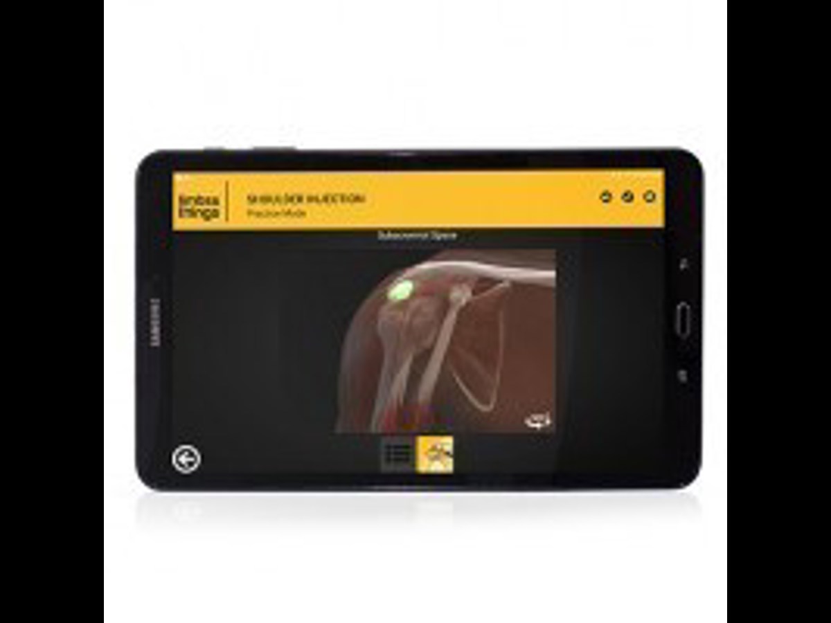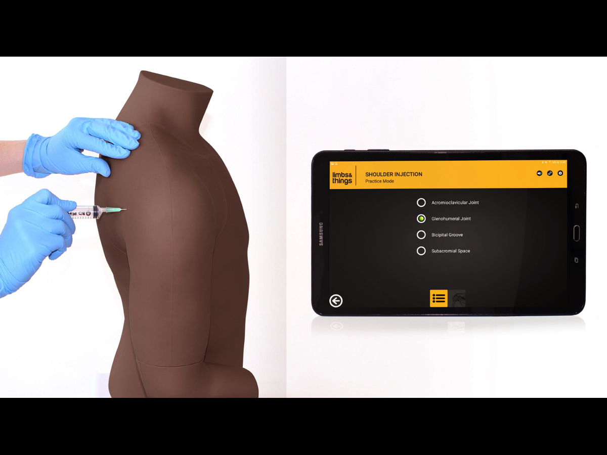 Yes, the Shoulder Trainer has an accompanying app which allows trainees to view expert guidance on best practise for joint injections. Instant feedback from the model will give positive reinforcement once the correct site is hit.