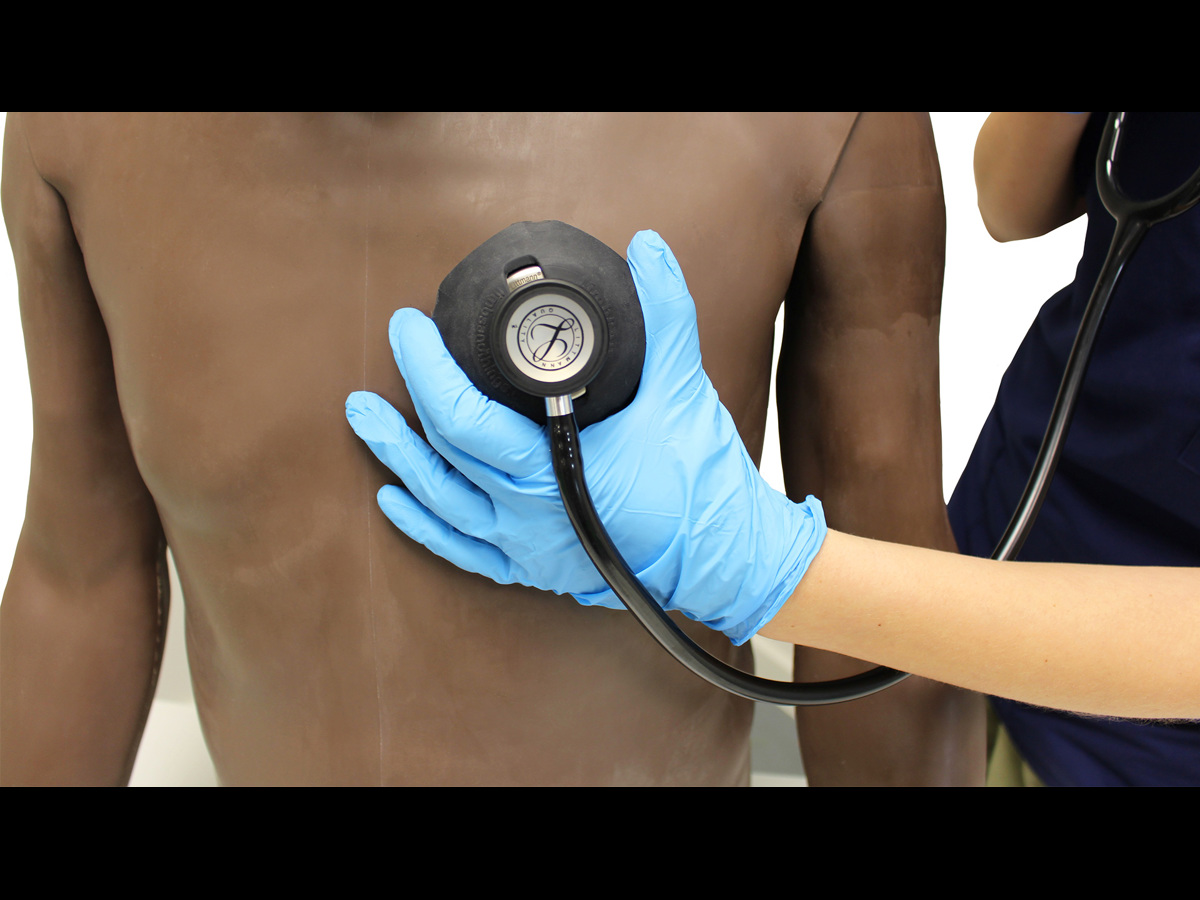 Designed with realism in mind, the Cardiovascular and Respiratory Exam Trainer includes a “LimbPAD”. Fit the device to any of the commonly used stethoscopes and simply use the stethoscope as normal.