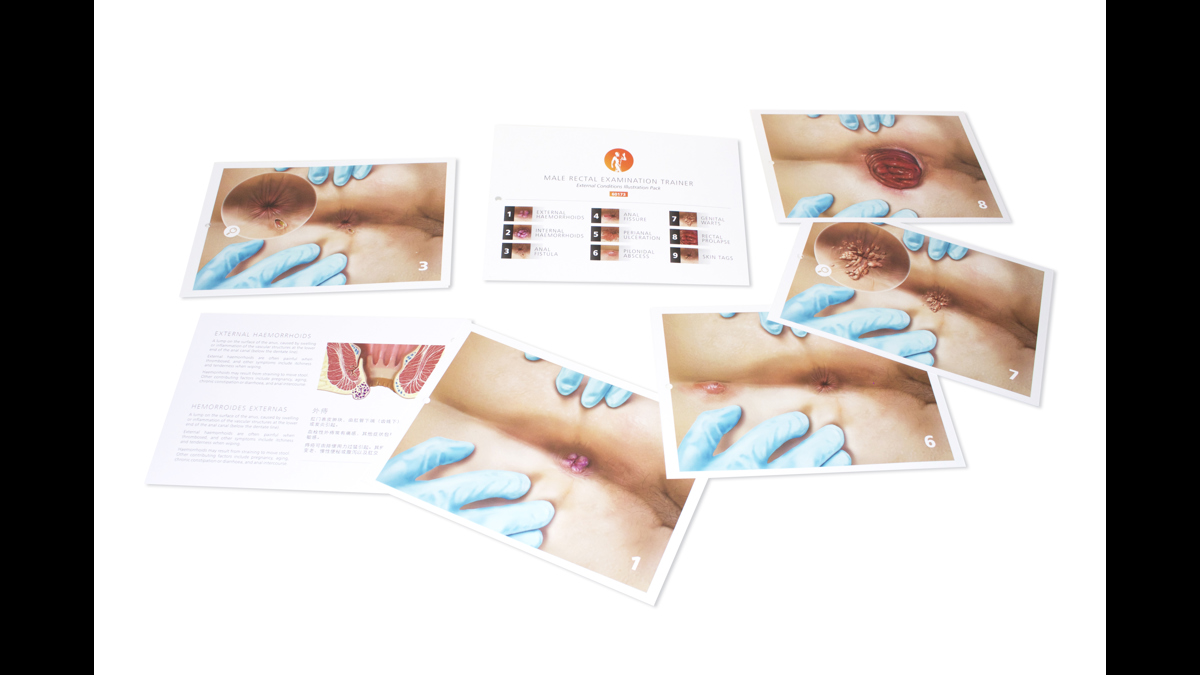 - Häfte med 9 illustrationer av åkommor runt ändtarmsöppningen – lämpliga för användning vid scenarioträning och OSCE-examinering