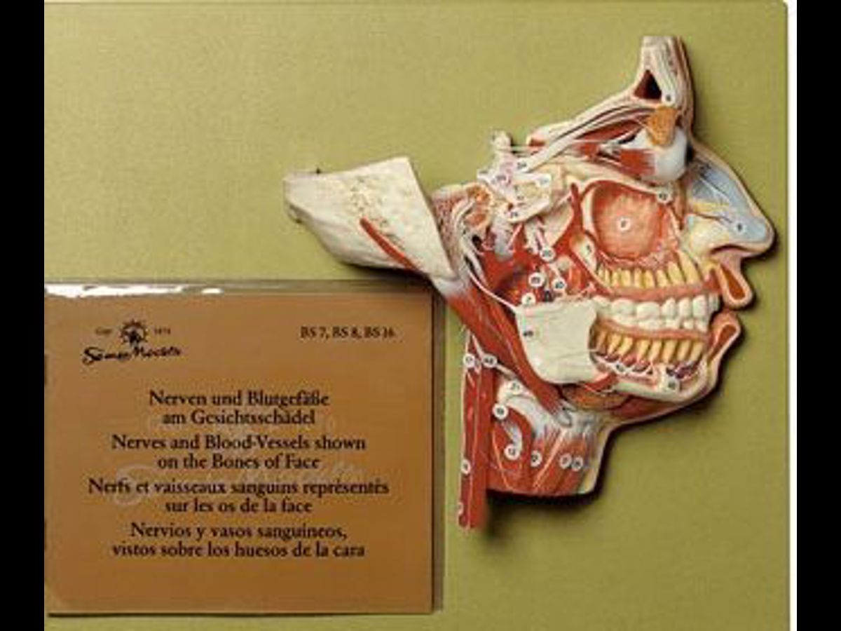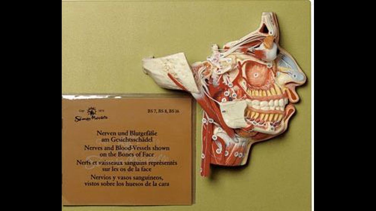 Visar musklerna, nerverna och kärlen på skallens högra ansiktshalva, i synnerhet trigeminusnerven och ansiktsnerven, kärlens nätverk och nerverna i ögonhålan samt övre och nedre käkdelen
