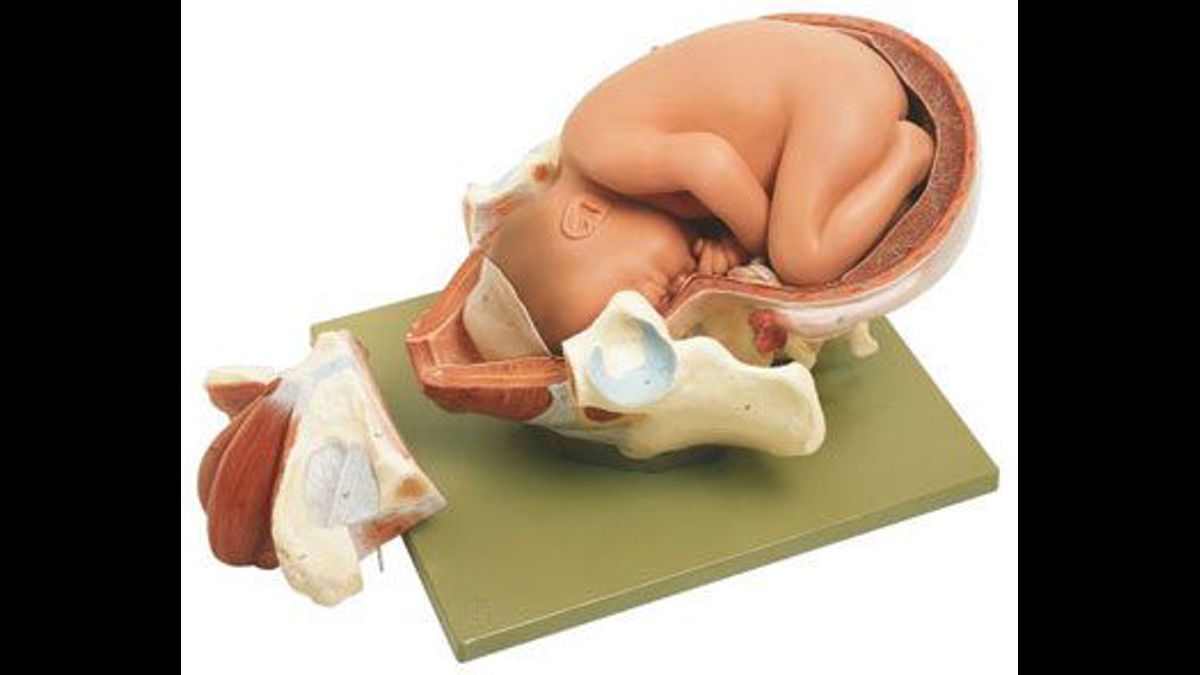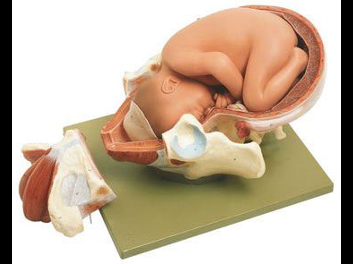 Naturlig storlek. Modellen visar starten av förlossningsprocessen. Består av tre delar. Monterad på en bas.