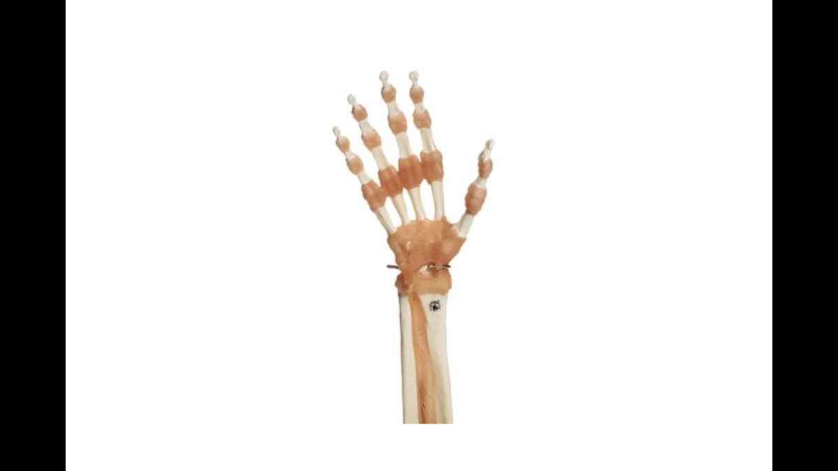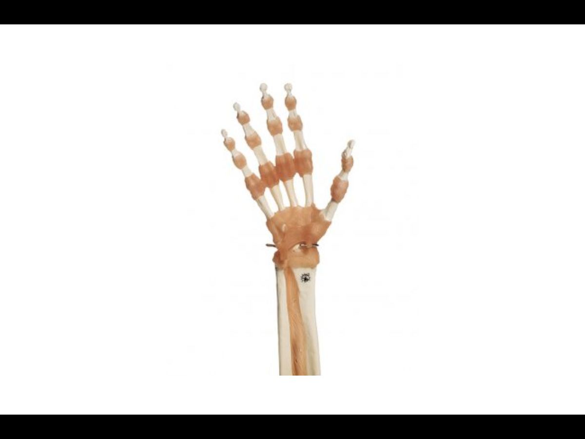 Naturlig storlek. Följande rörelser är möjliga: flexion och extension, abduction och adduction, opposition och reposition av tummen, dorsal och palmar flexion, radial abduction och ulnar abduction av handen.