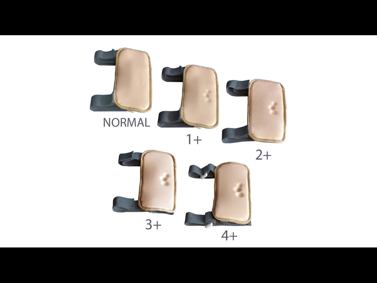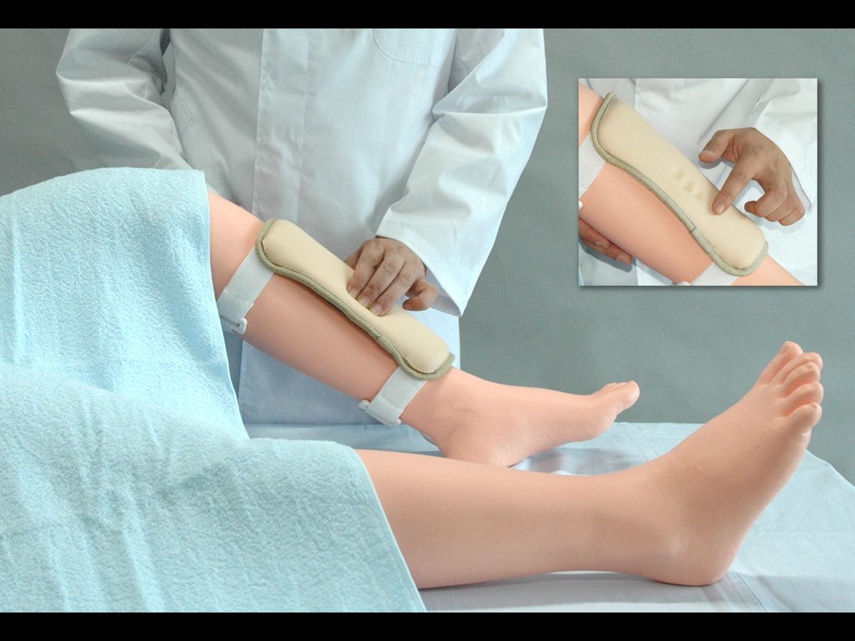 Trainers can be applied to the lower leg of a simulated patient or manikin for a true to life training experience. The pad grading is based on “Mosby’s Guide to Physical Examination, 7th Edition”.