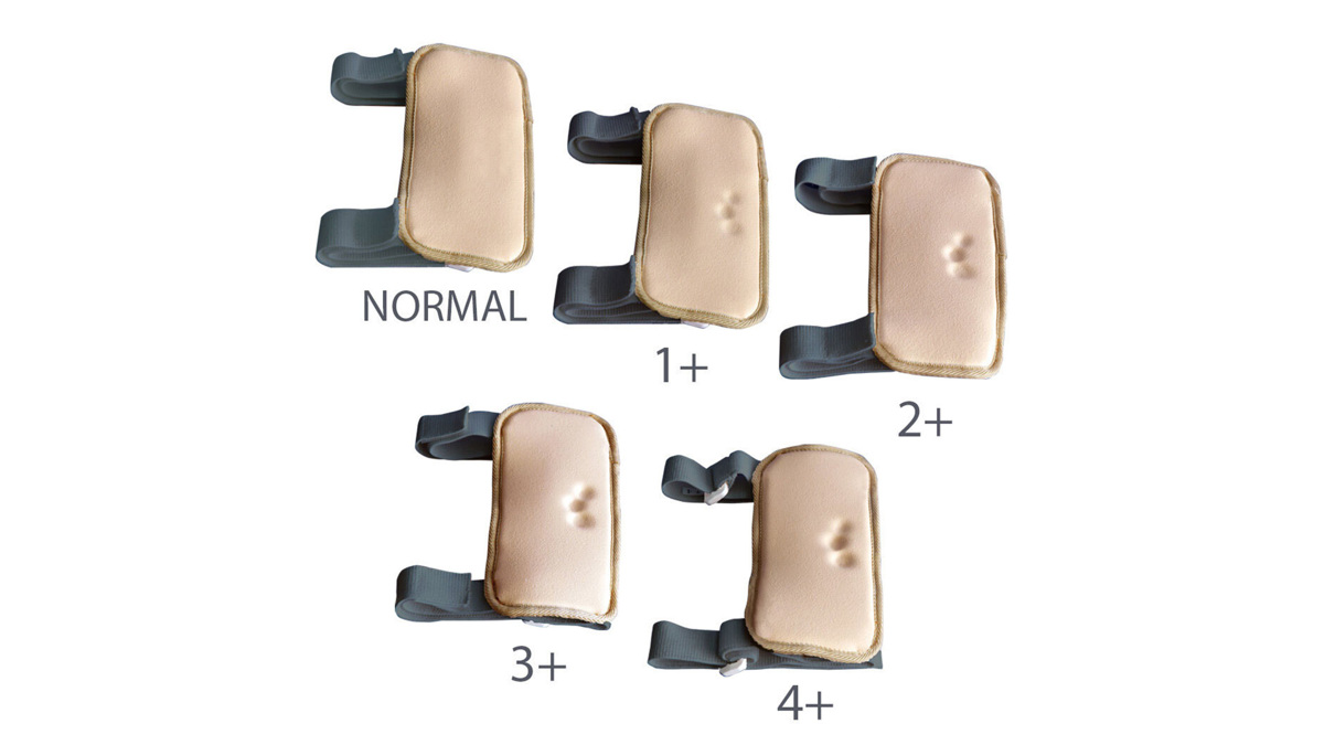Kyoto Kagaku’s Pitting Edema Strap On Simulator is comprised of five variations of pitting edema pads. Graded from Normal to +4, it offers different resistances, depths of indentations, and length of time to rebound.