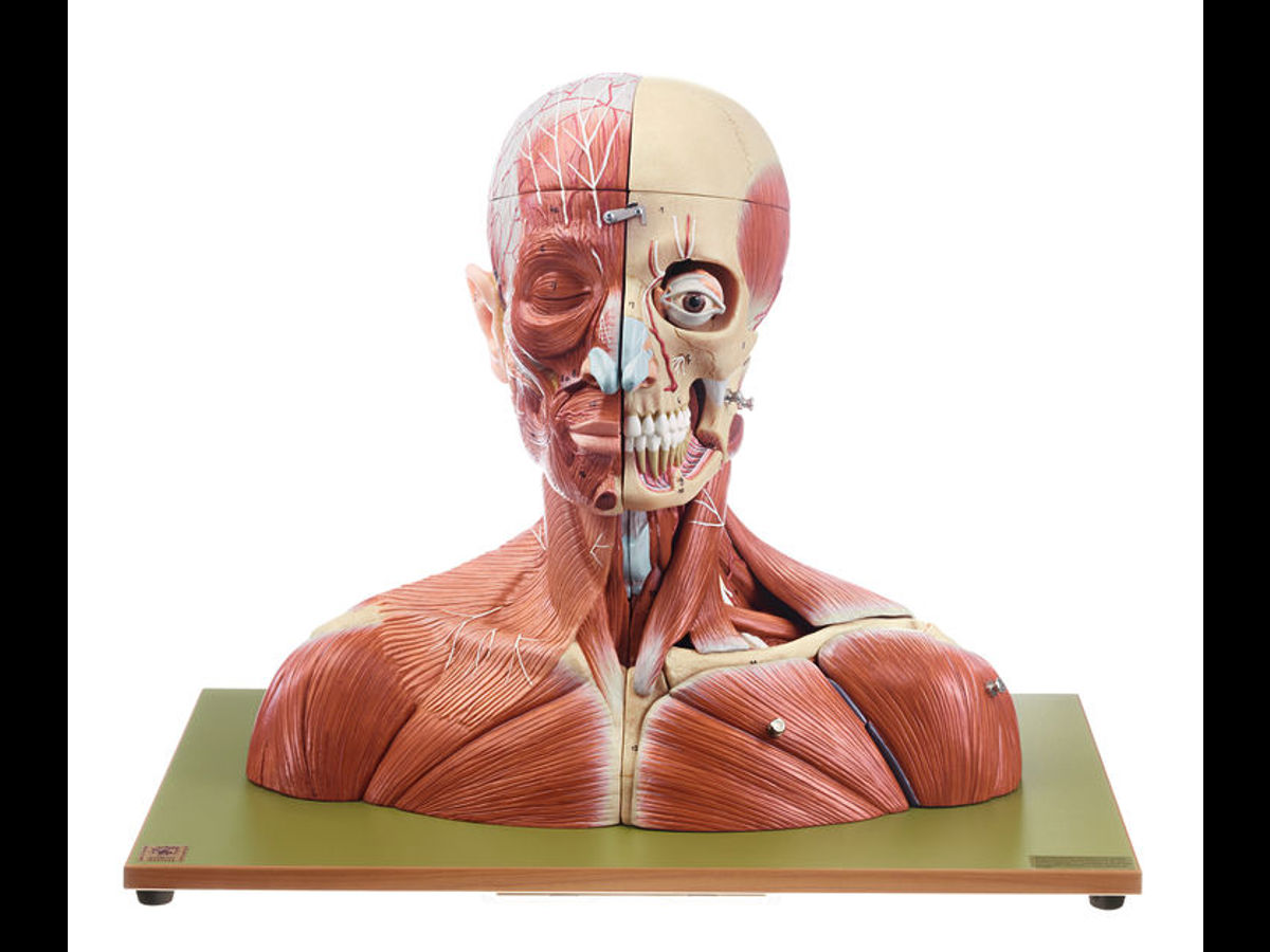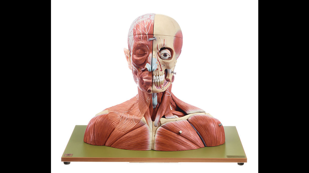 Naturlig storlek. Kan delas på mitten i två halvor. När kraniet tas bort kan hjärnans åtta delar flyttas på. Består av totalt 19 delar. Monterad på en platta.