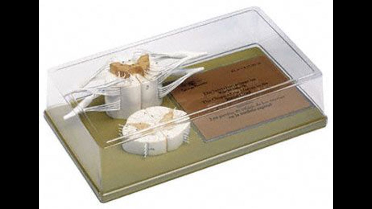 Uppförstorad ungefär 5 gånger sin verkliga storlek. Sektionen genom ryggraden är förstorad ungefär 10 gånger. I ett stycke. Monterad på en platta under ett avtagbart transparent överdrag.