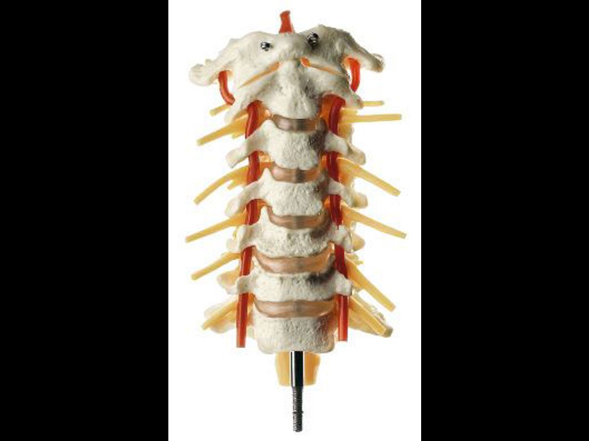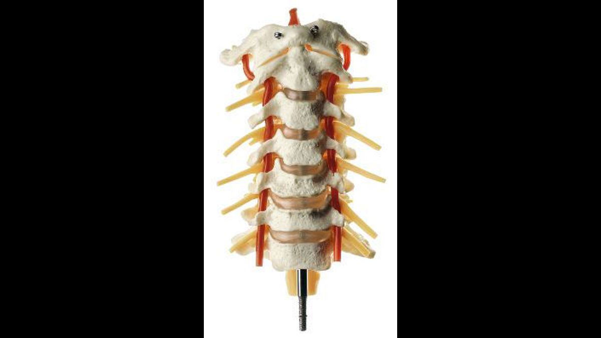 Gjutning baserad på en riktig människa. Monterad och flexibel med ryggmärg och nervändslut. På en ställning med en bas.