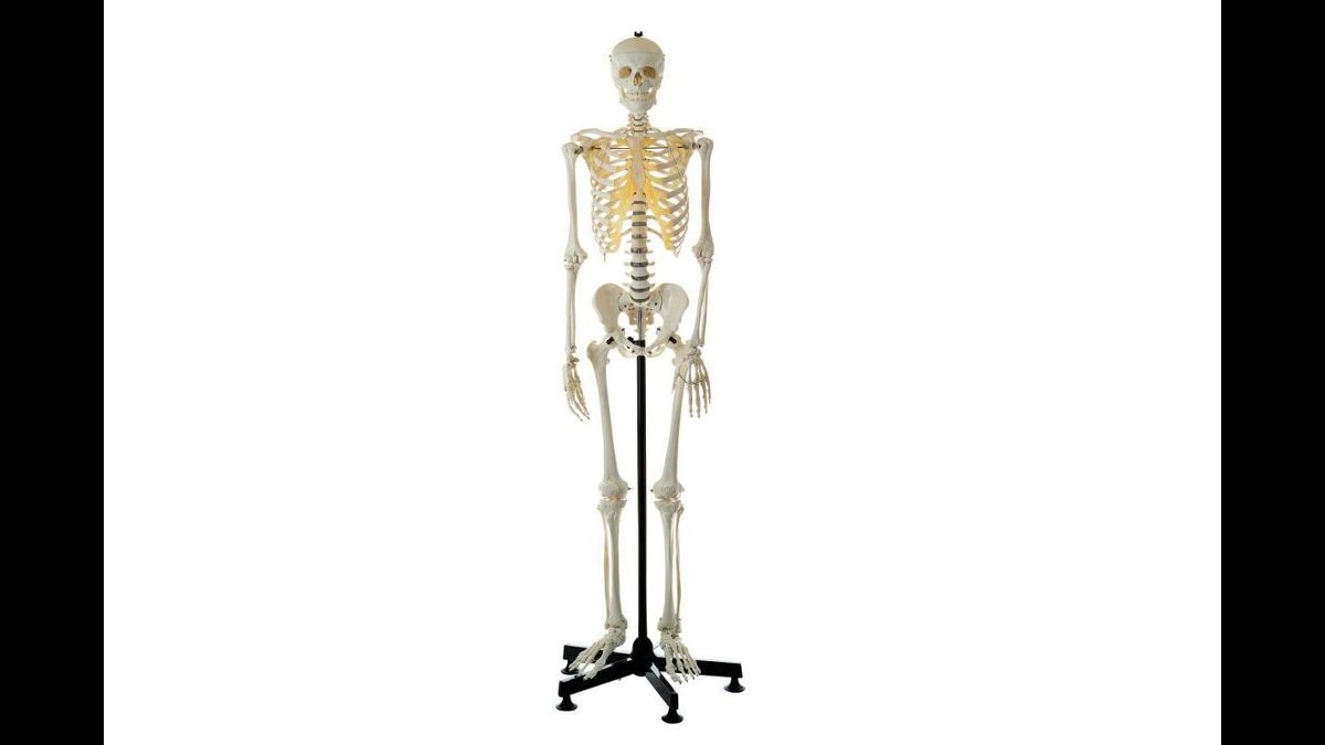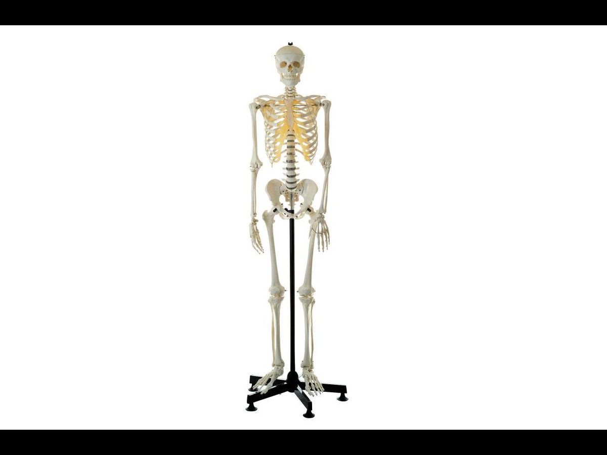 Naturlig gjutning av ben från en vuxen man. Visar anatomiska detaljer av benstrukturen i verklig storlek. Skallen har borttagbar huvudskål och underkäke. Rörliga leder och extremiteter. Höger och vänster fot kan tas bort. Monterad upprätt på en ställning. Har ett överdrag för att skydda mot damm.
