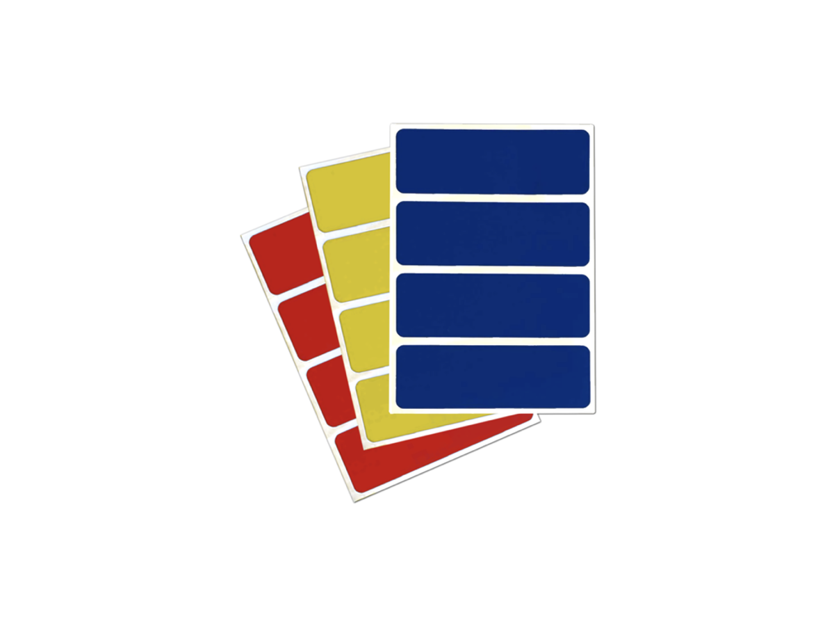 Pack of 12 rectangular stickers in red, yellow, and blue. For use with eoSim instruments to enable instrument tracking and metrics in the SurgTrac software.