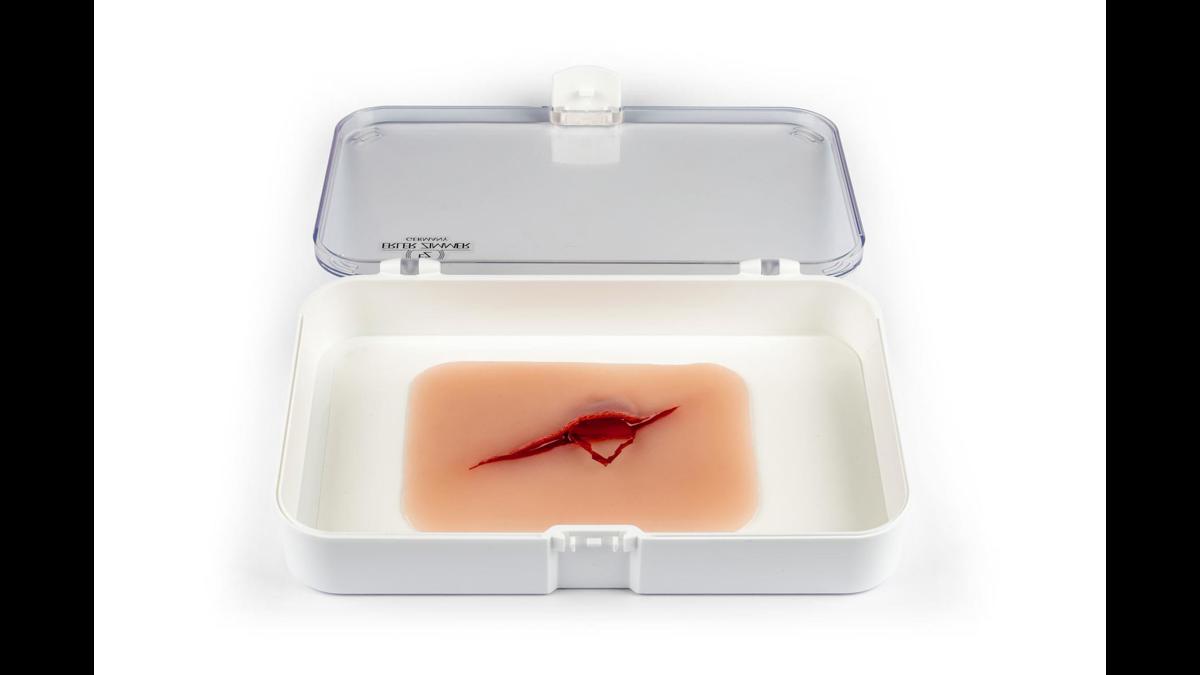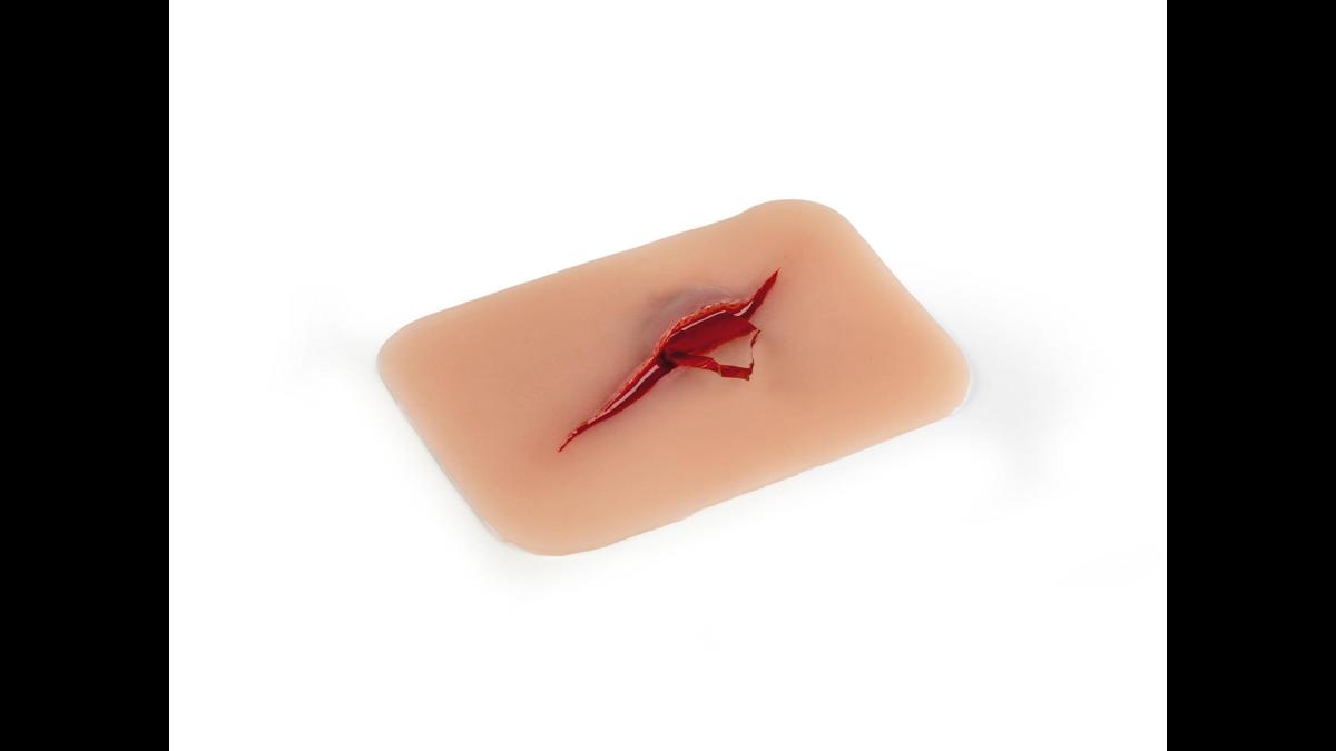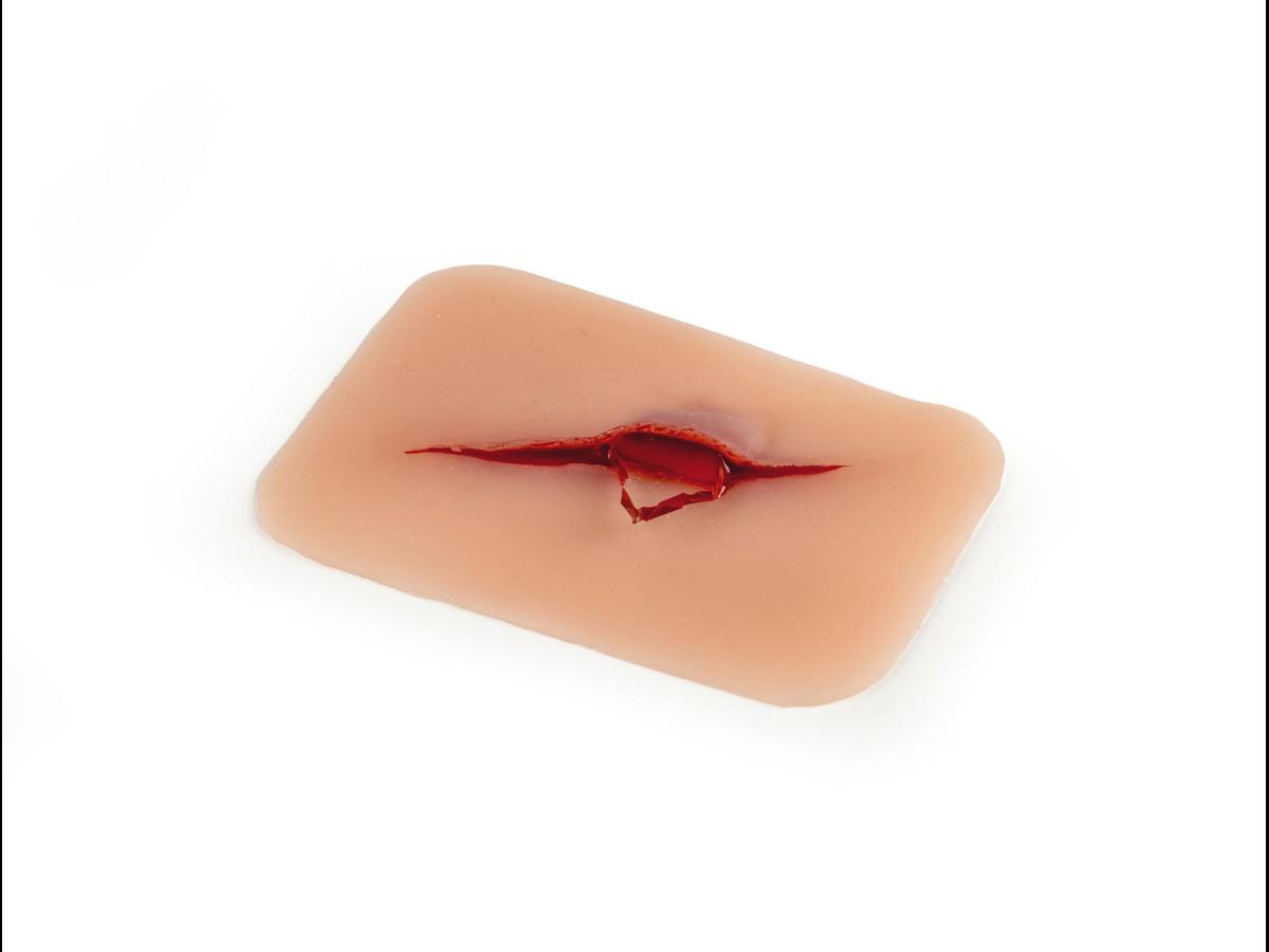 Realistiskt sårmoulage med snitt där ett glasfragment sitter kvar i såret. Mjukt, säkert material som kan fästas på hud eller träningsdocka.