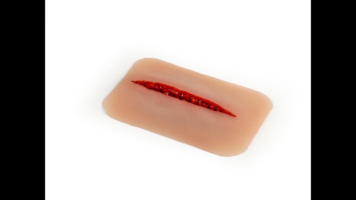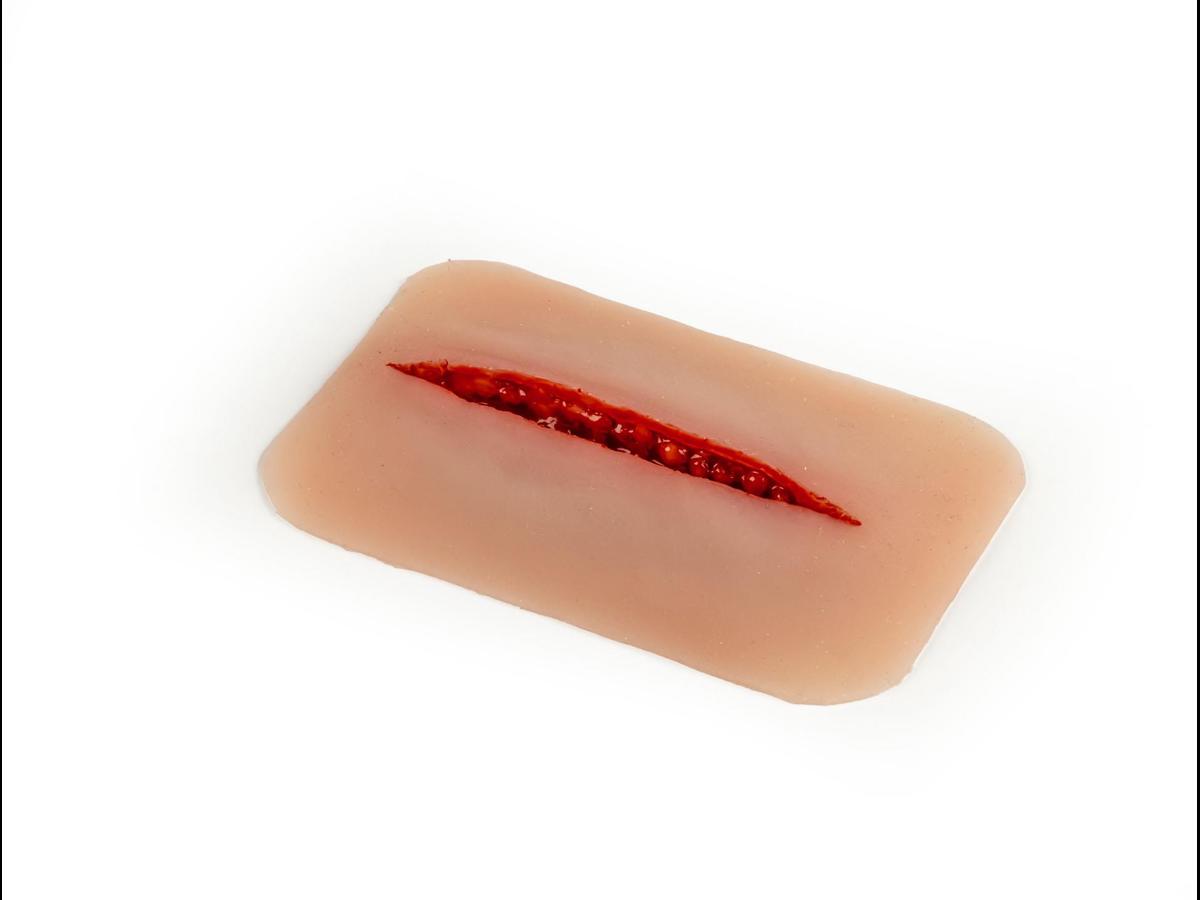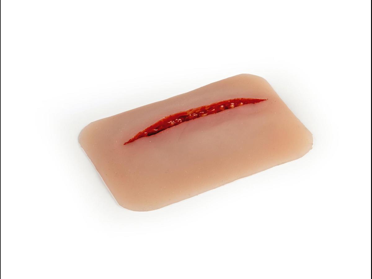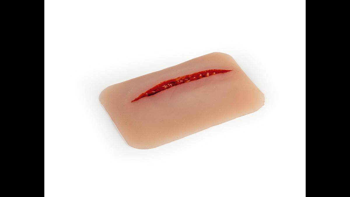 Litet sårmoulage med ca 1 cm djupt snitt; fästs på hud eller träningsdocka, med möjlighet till extra hudlim för längre pass.