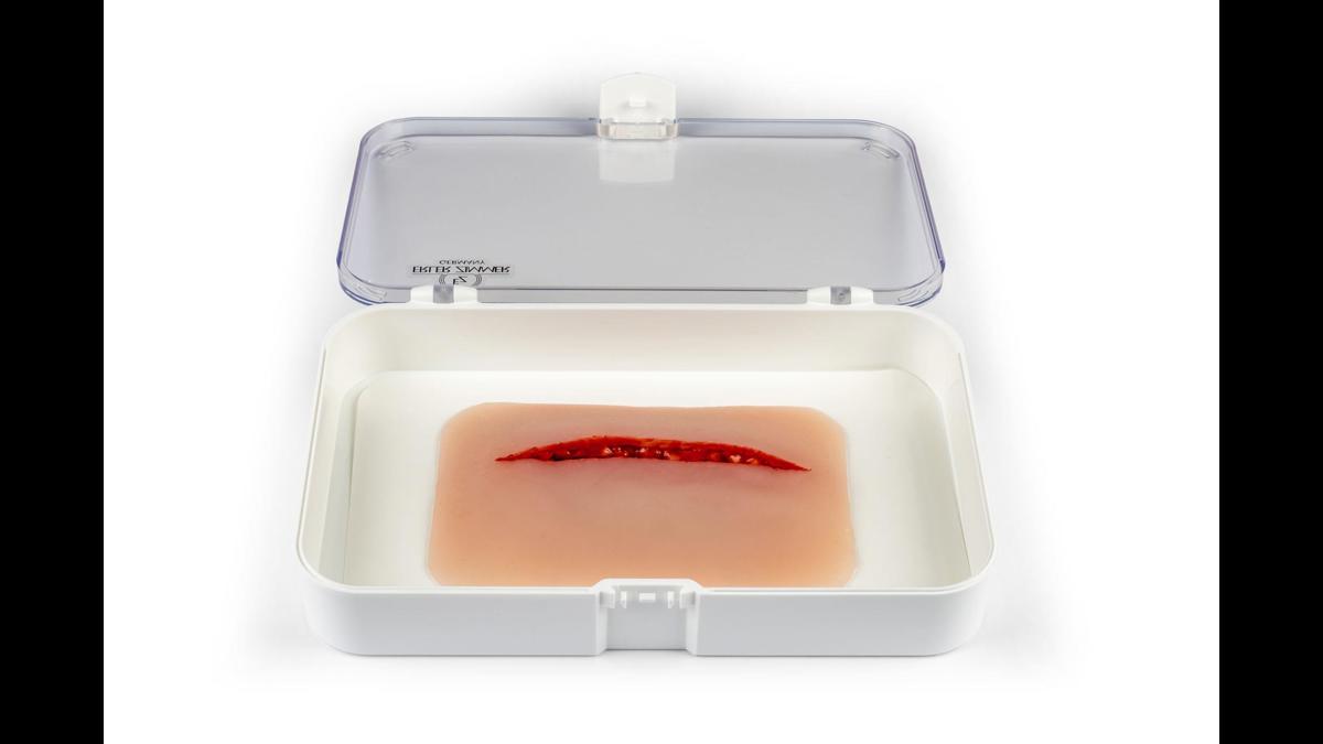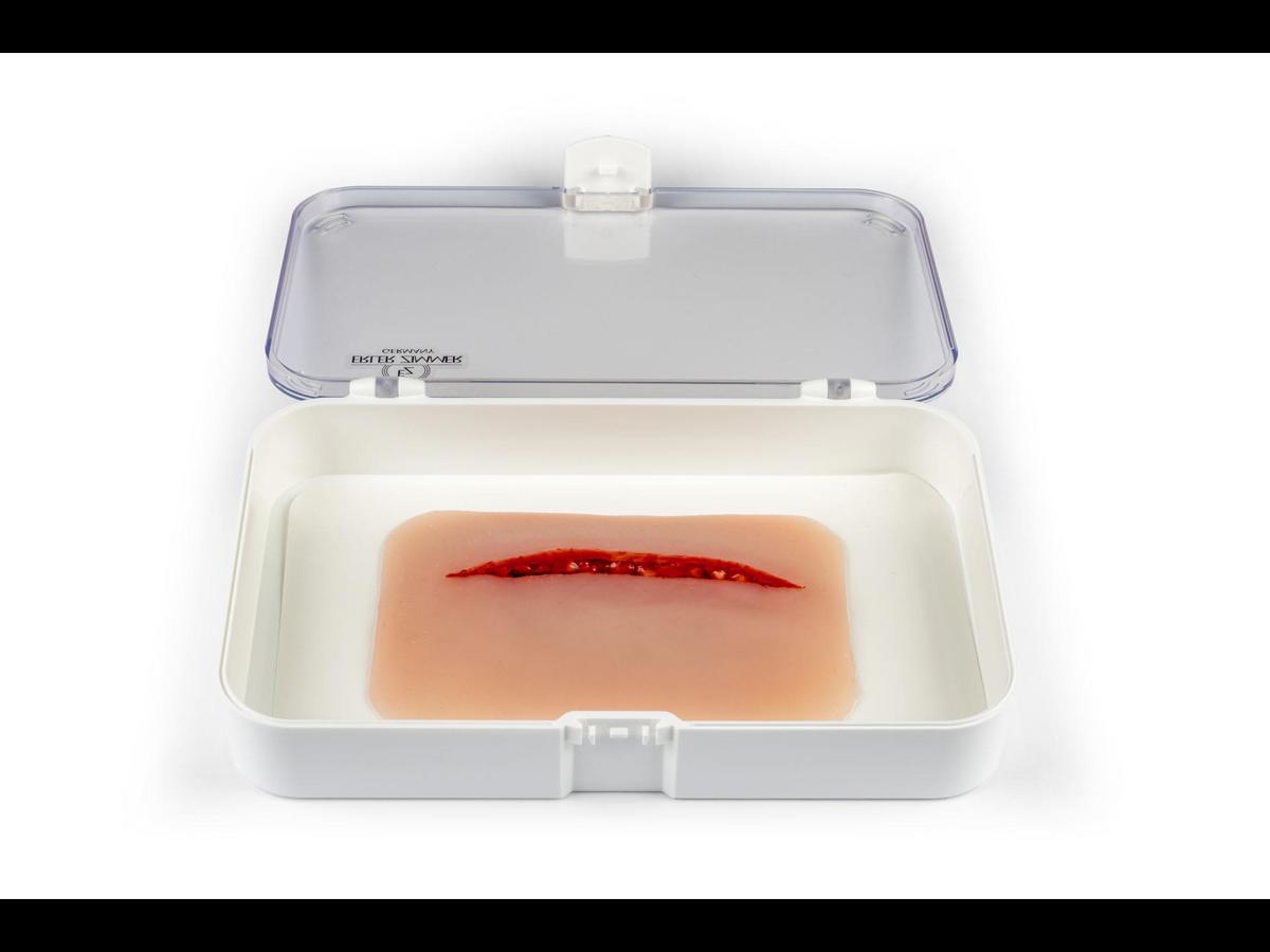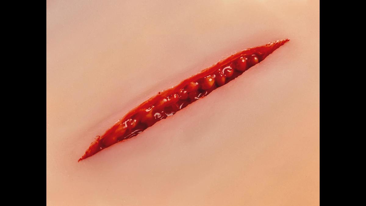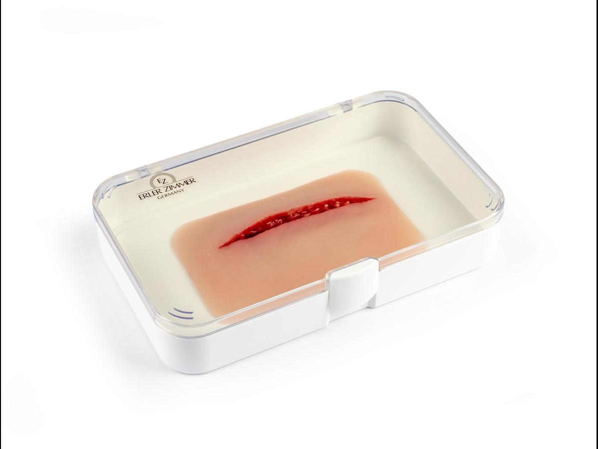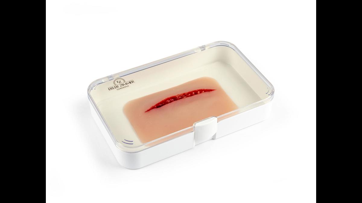 Litet sårmoulage med ca 1 cm djupt snitt; fästs på hud eller träningsdocka, med möjlighet till extra hudlim för längre pass.