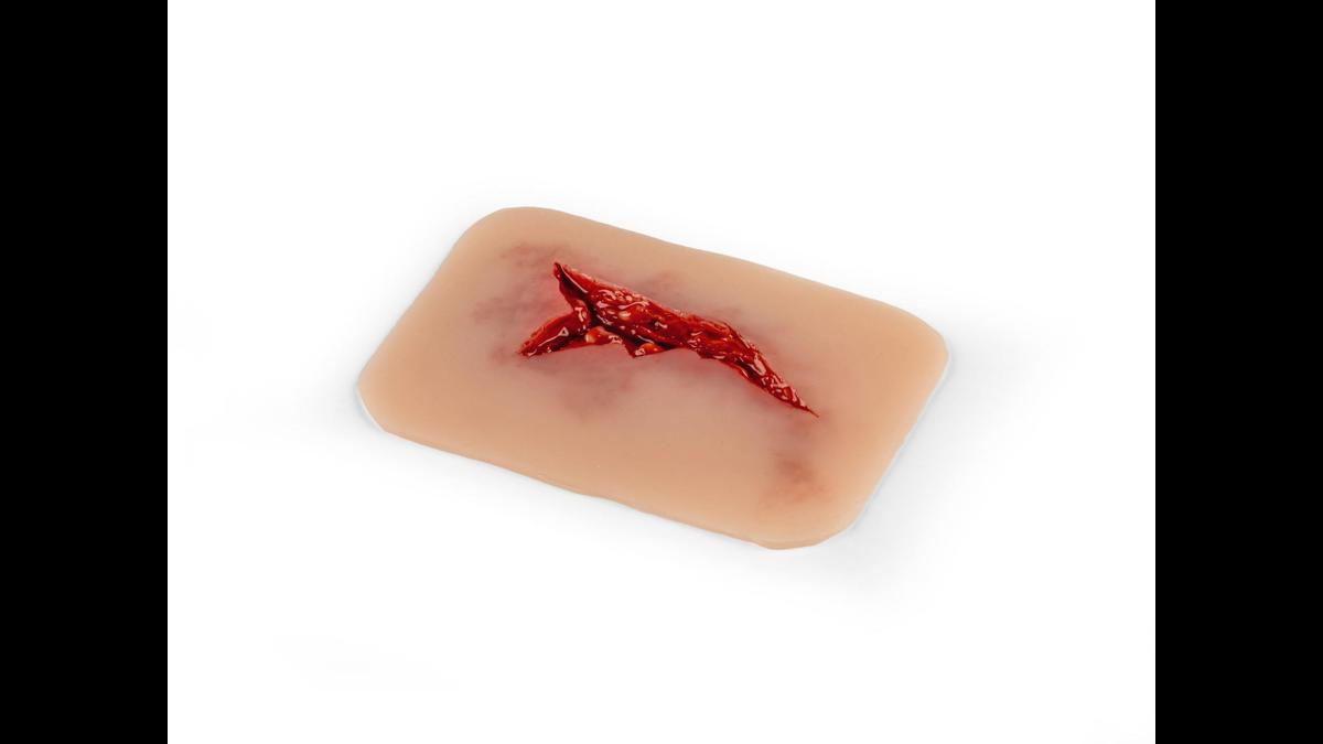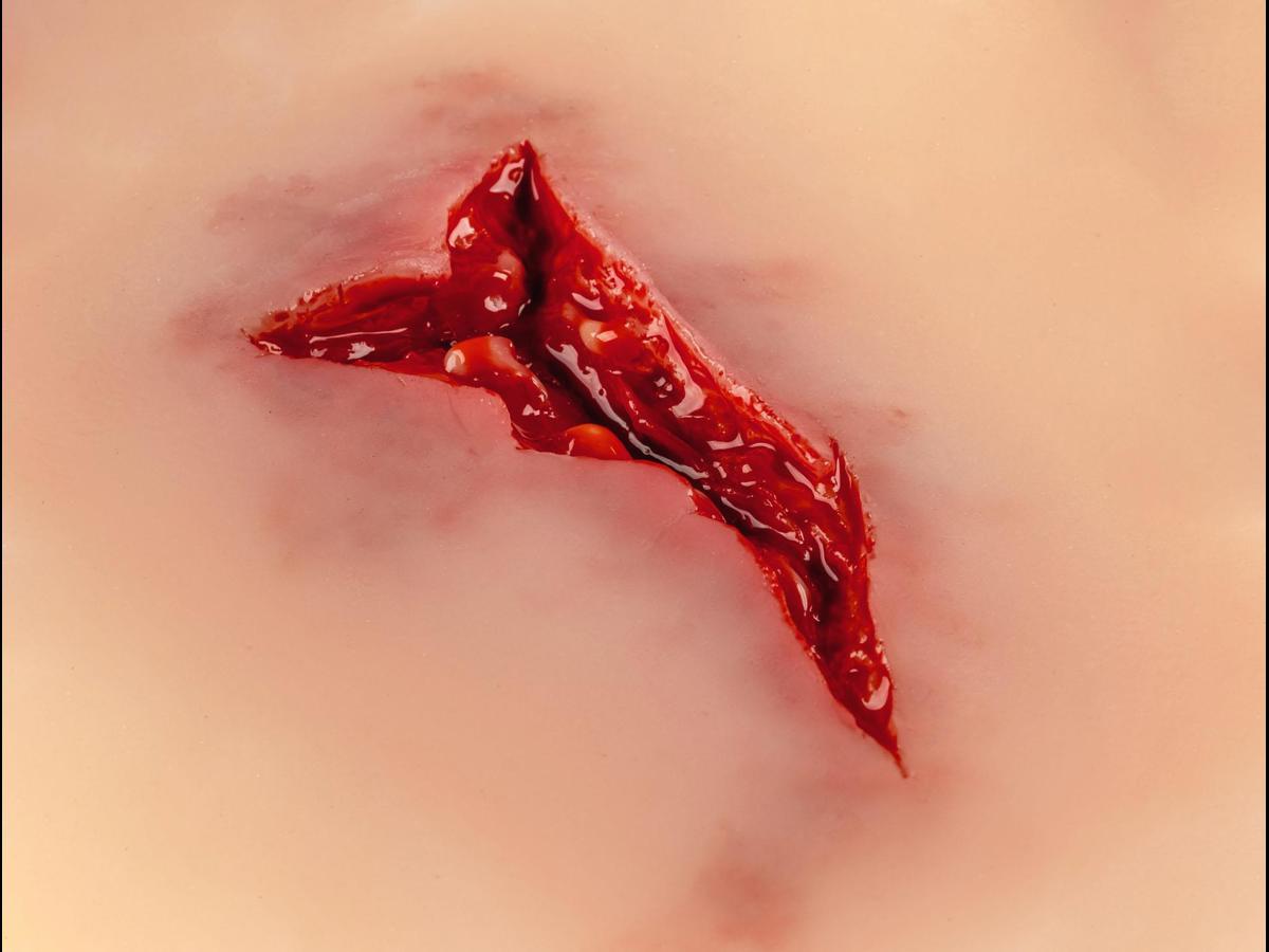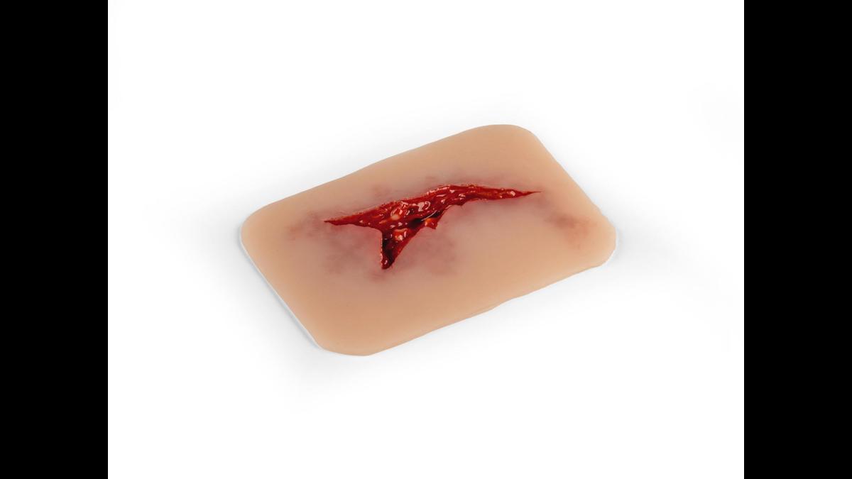 Realistiskt sårmoulage som visar en laceration med ojämn sårkant. Självhäftar på hud eller manikin; hudlim kan användas för längre pass.