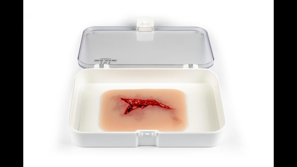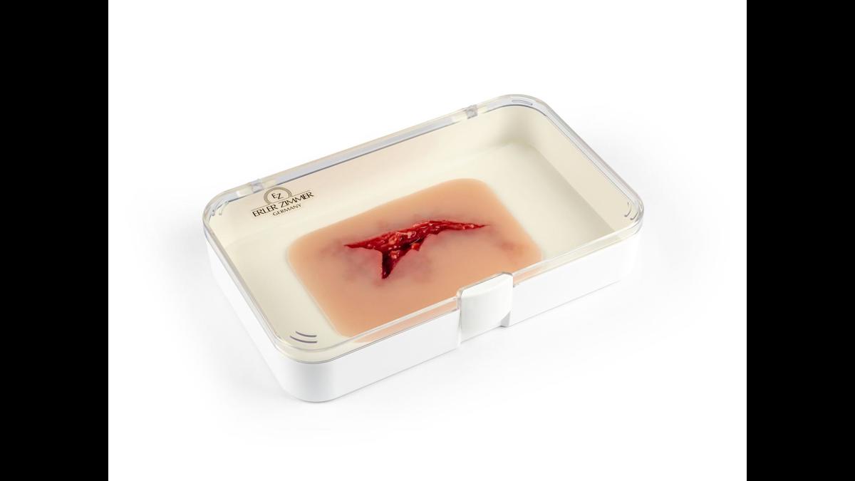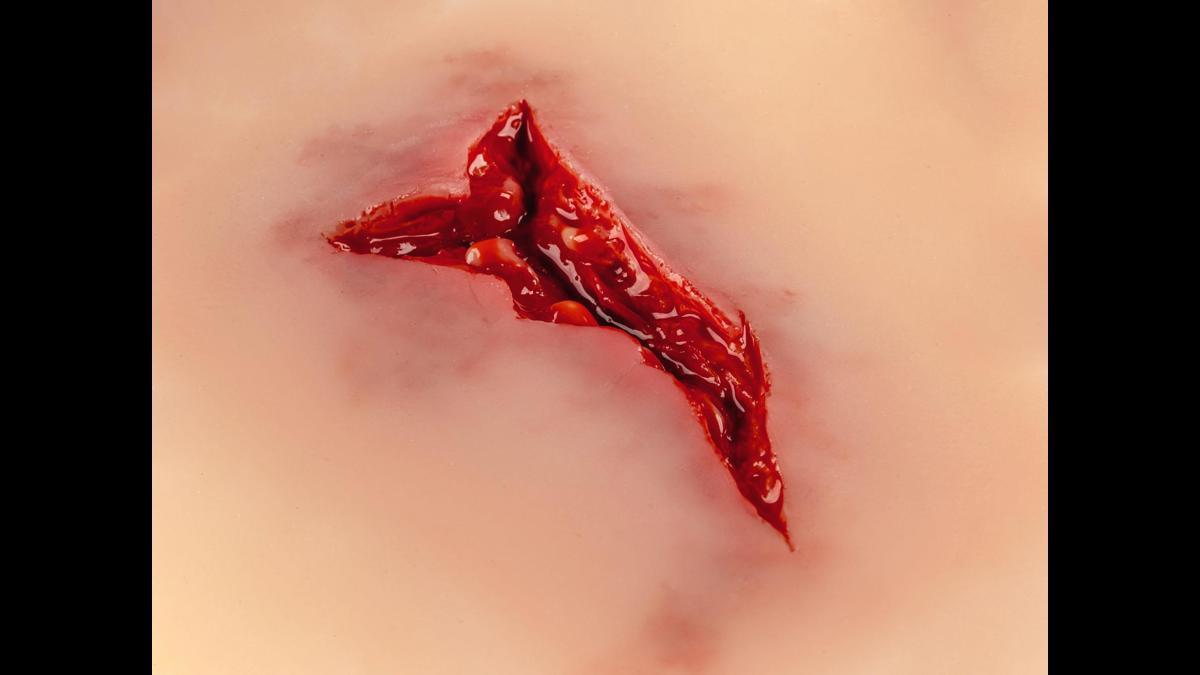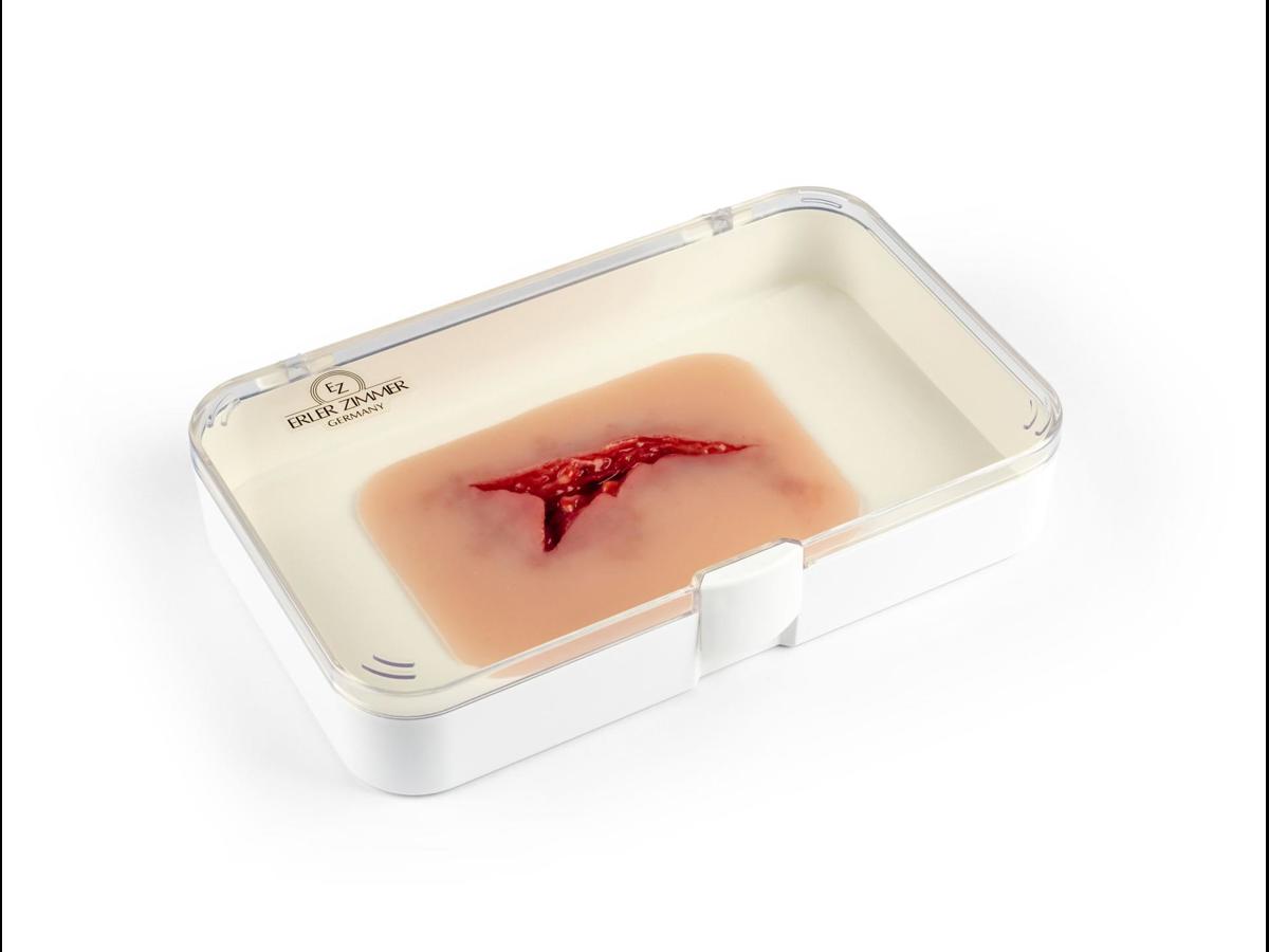 Realistiskt sårmoulage som visar en laceration med ojämn sårkant. Självhäftar på hud eller manikin; hudlim kan användas för längre pass.