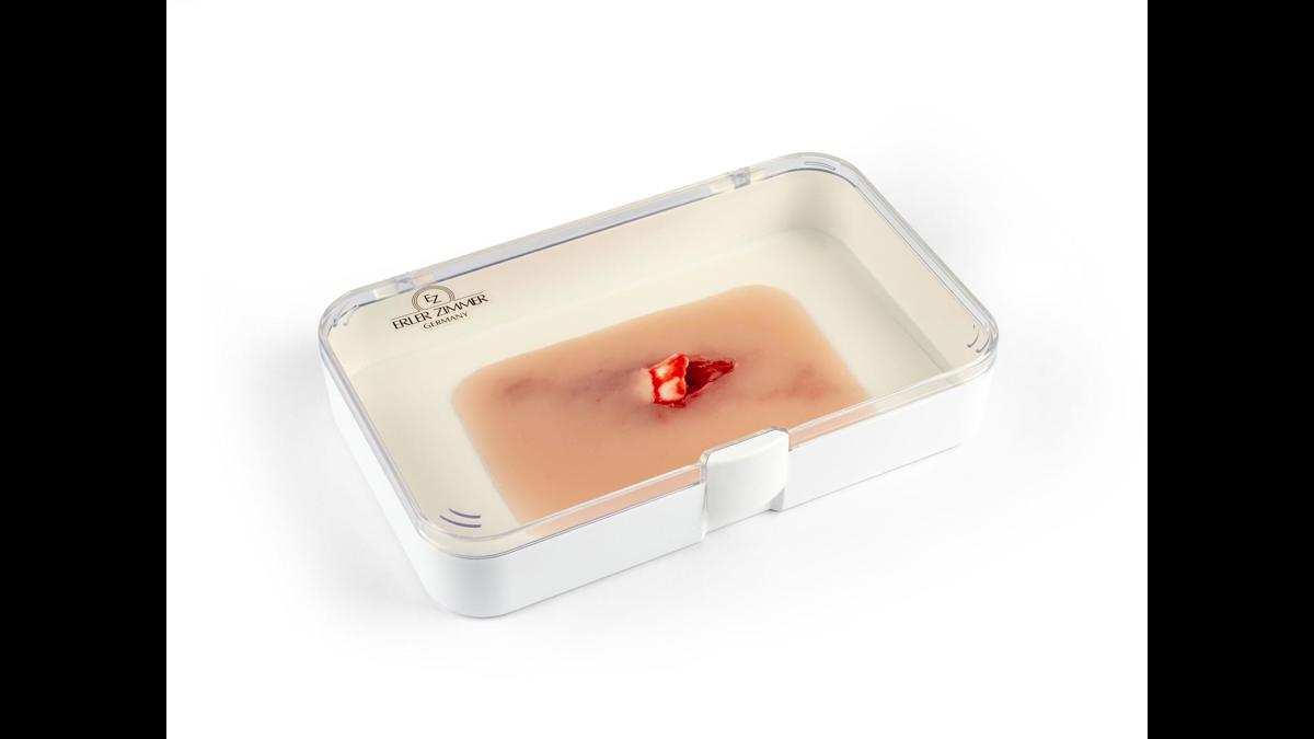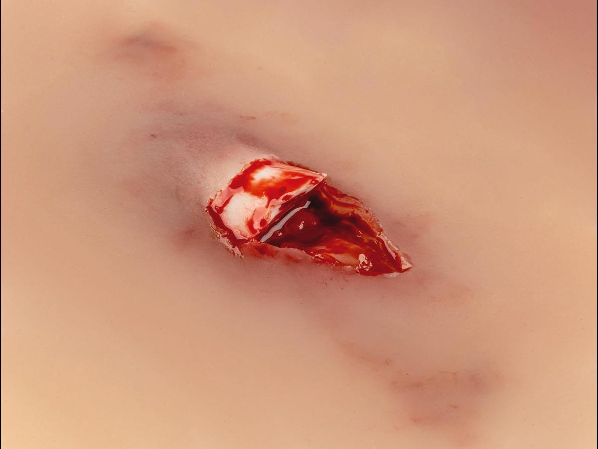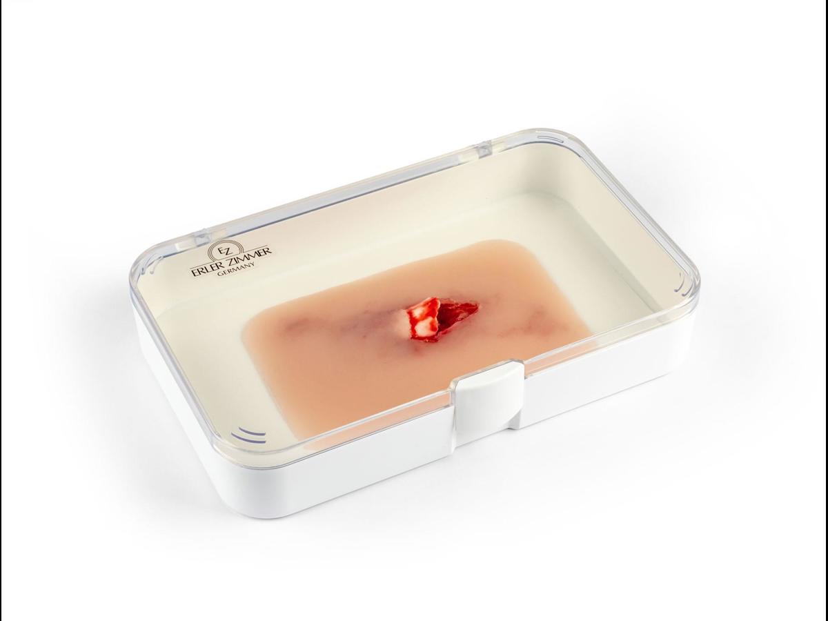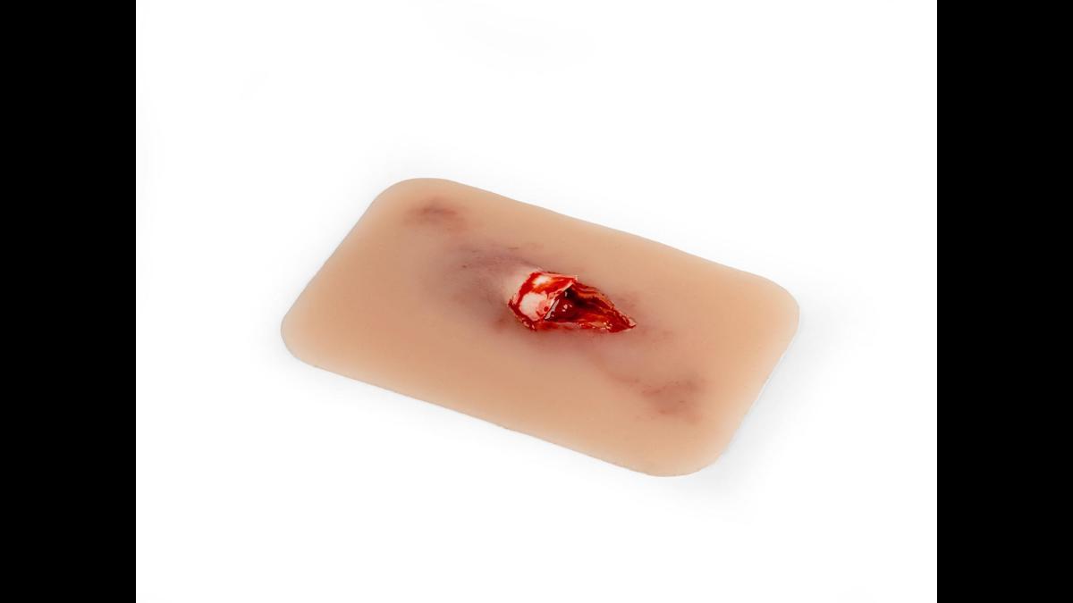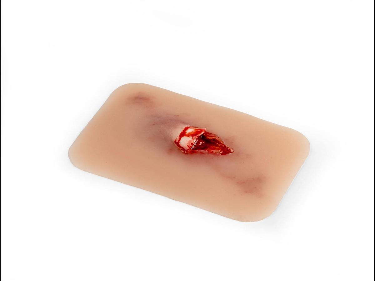 Wound moulage “Open fracture” visar en öppen fraktur i ett mindre extremitetsben, såsom underarmen, med synligt benfragment och vävnadsskada runt såret. Moulagen är självhäftande och kan appliceras direkt på både mänsklig hud (standardiserad patient) och på manikiner, vilket underlättar träning i akut omhändertagande vid traumatiska frakturer, inklusive sårbedömning, immobilisering, blödningskontroll och förbandsläggning. För längre övningspass eller vid behov av starkare vidhäftning finns ett särskilt hudlim som tillval. Ett mångsidigt och realistiskt hjälpmaterial för simulationer inom akutsjukvård, prehospital träning och medicinsk utbildning.