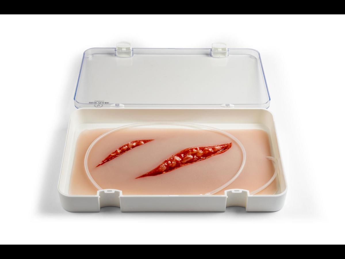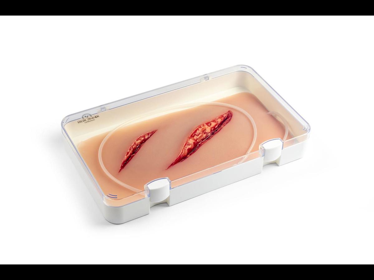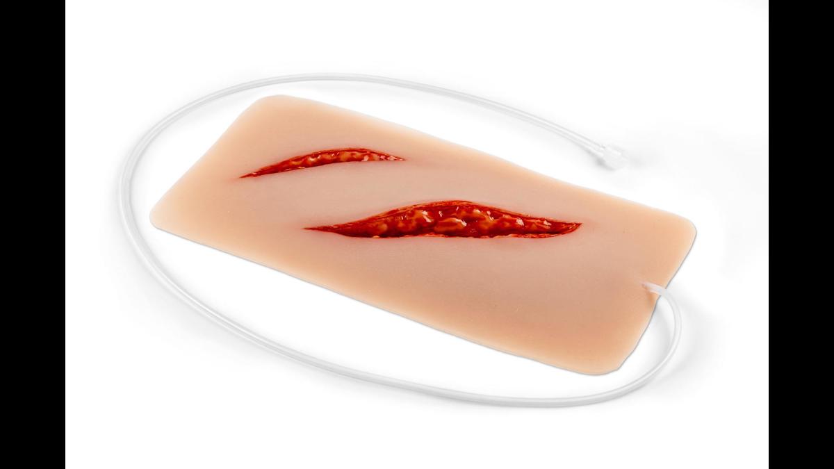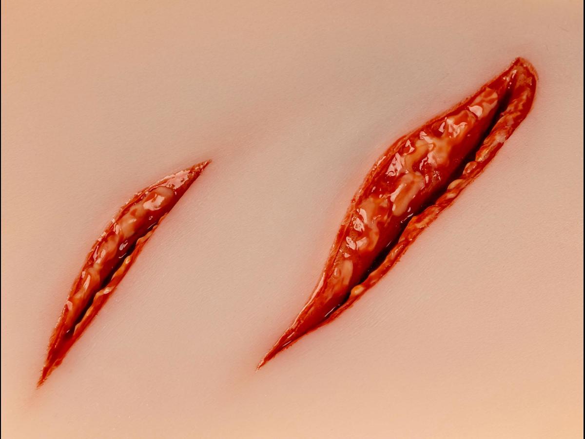 Stort, djupt skärsår‑moulage med blodningsfunktion som kan fästas på hud eller träningsdocka.