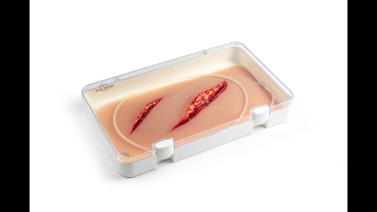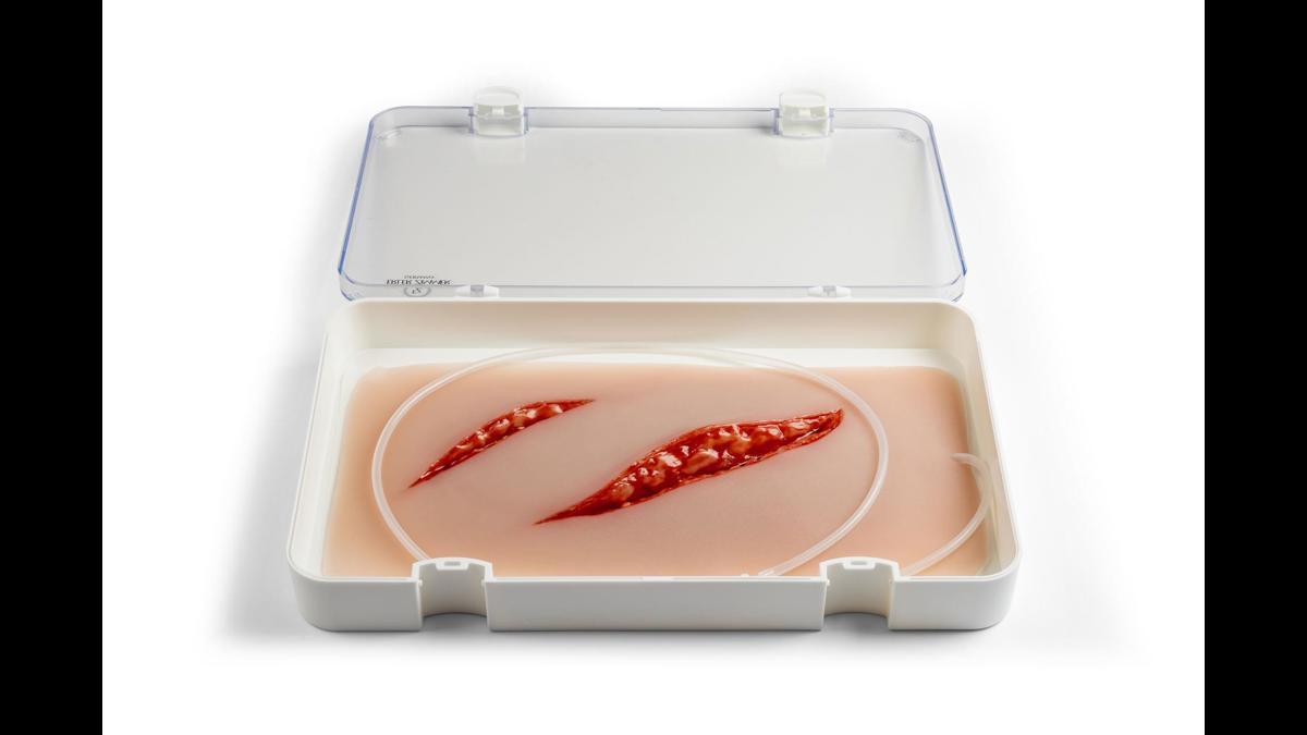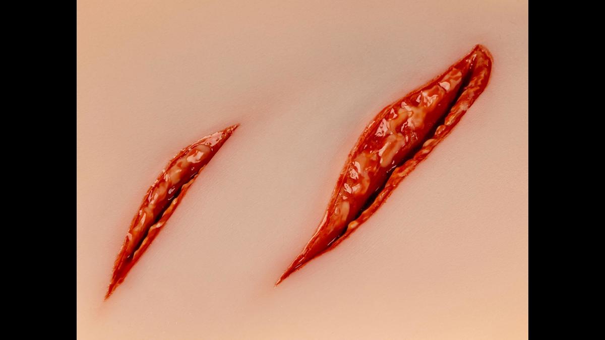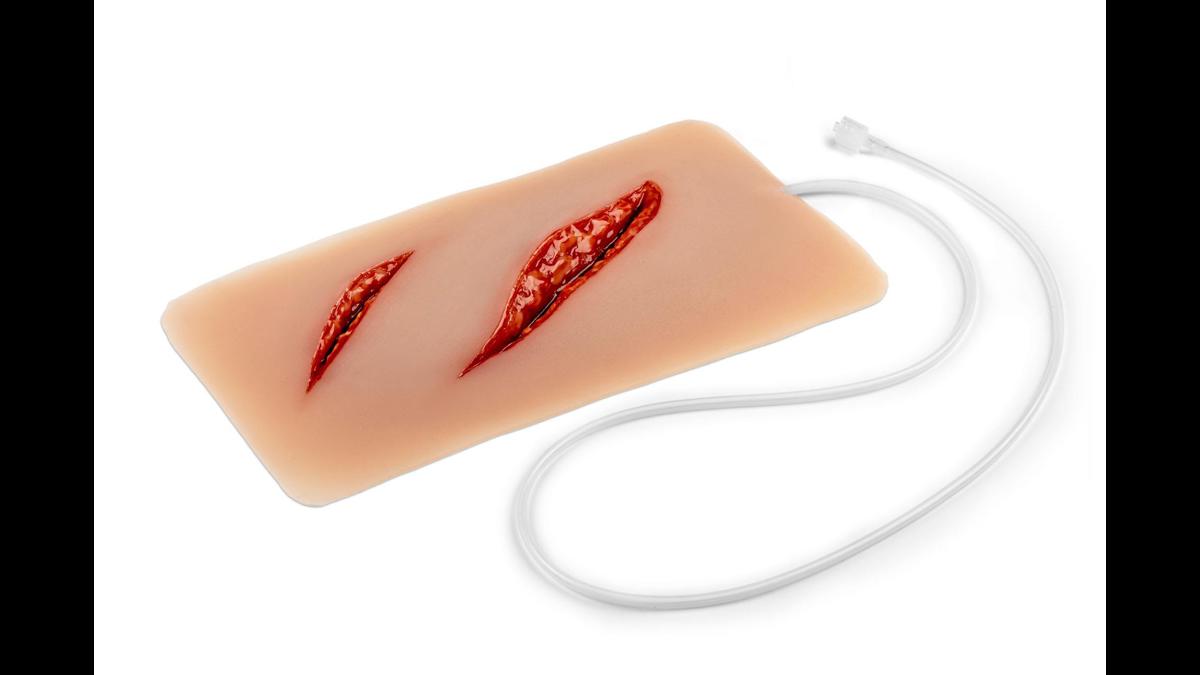 Stort, djupt skärsår‑moulage med blodningsfunktion som kan fästas på hud eller träningsdocka.