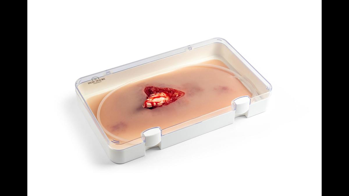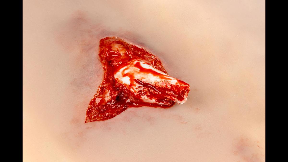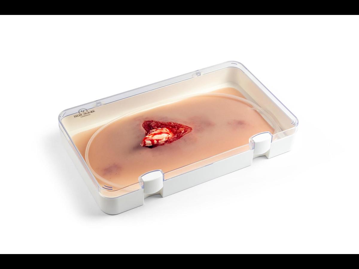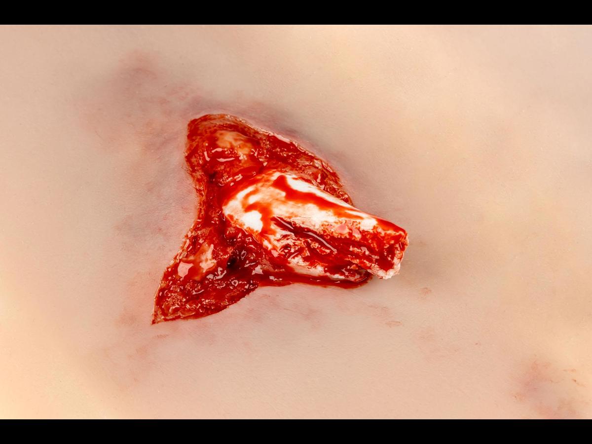 Wound moulage “Open fracture, leg with bleeding function” visar en öppen fraktur i en större extremitetsben (t.ex. femur) med exponerat benfragment och integrerad kanal för simulerad blödning. Moulagen är designad för att träna akut omhändertagande vid svåra frakturer—inklusive snabb bedömning, immobilisering, blödningskontroll och förberedelse för transport. Den självhäftar direkt på mänsklig hud (standardiserad patient) eller på manikiner; för längre övningar eller förbättrad vidhäftning kan ett särskilt hudlim användas (tillval). Ett kvalitativt hjälpmedel för realistisk traumaträning inom akutsjukvård, prehospitala enheter och utbildningsprogram.