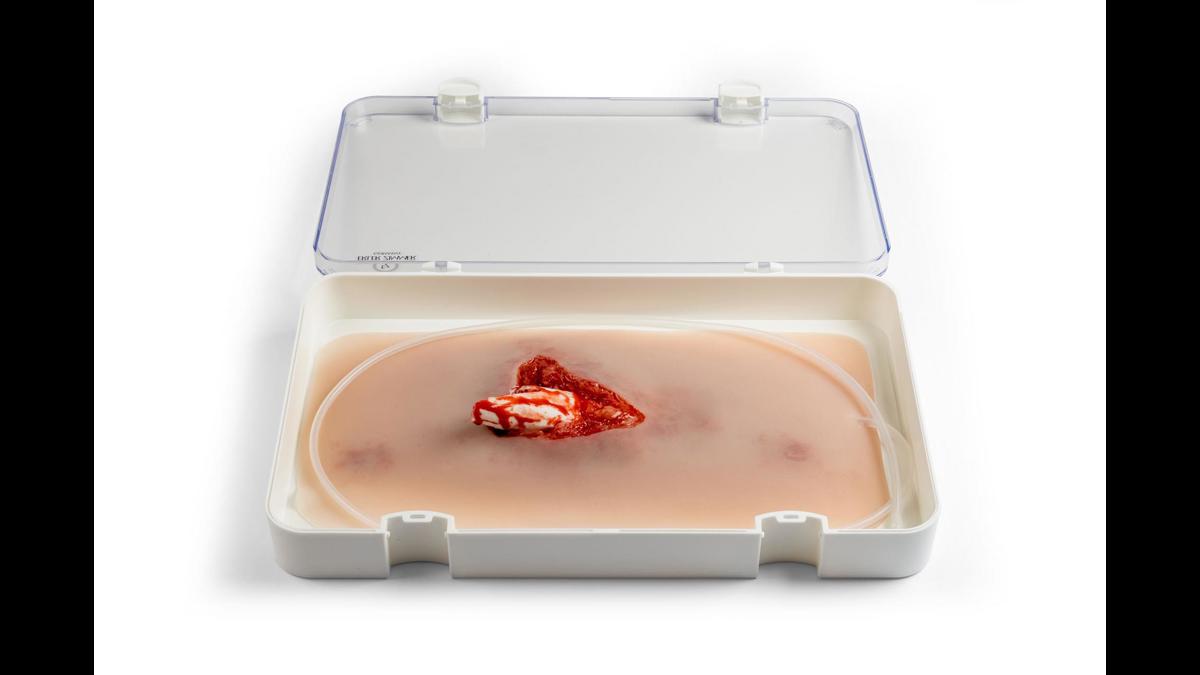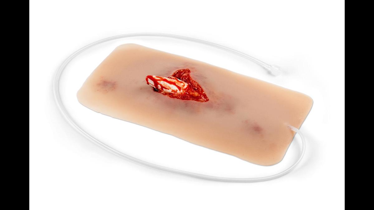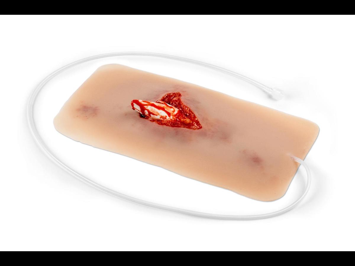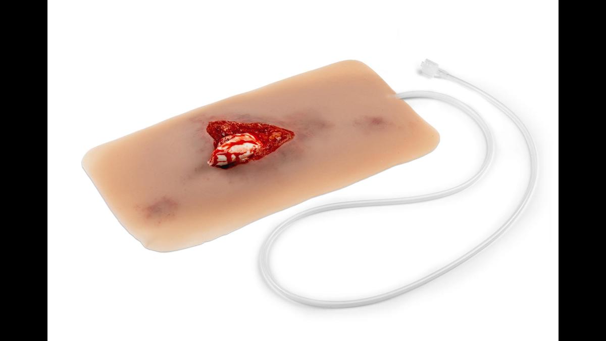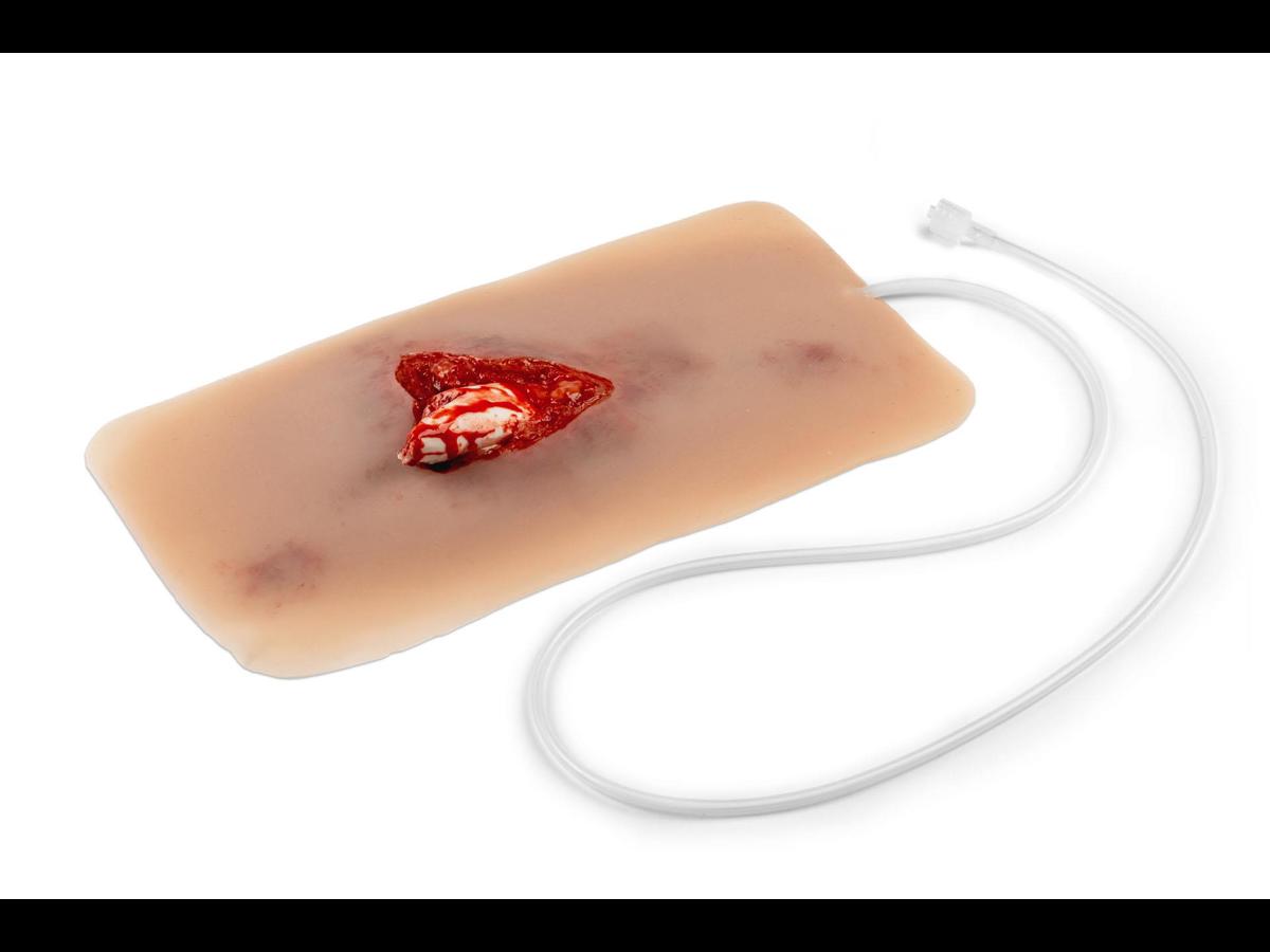 Wound moulage “Open fracture, leg with bleeding function” visar en öppen fraktur i en större extremitetsben (t.ex. femur) med exponerat benfragment och integrerad kanal för simulerad blödning. Moulagen är designad för att träna akut omhändertagande vid svåra frakturer—inklusive snabb bedömning, immobilisering, blödningskontroll och förberedelse för transport. Den självhäftar direkt på mänsklig hud (standardiserad patient) eller på manikiner; för längre övningar eller förbättrad vidhäftning kan ett särskilt hudlim användas (tillval). Ett kvalitativt hjälpmedel för realistisk traumaträning inom akutsjukvård, prehospitala enheter och utbildningsprogram.