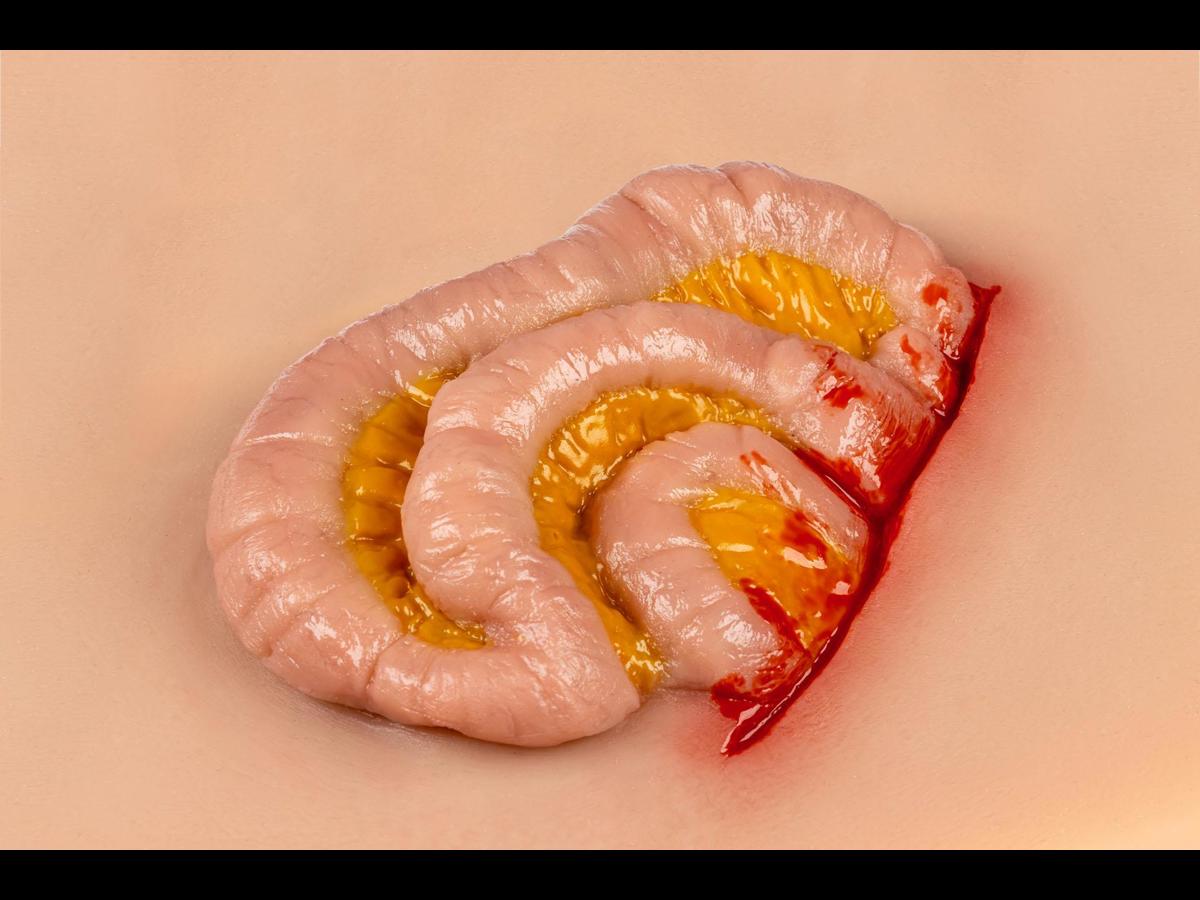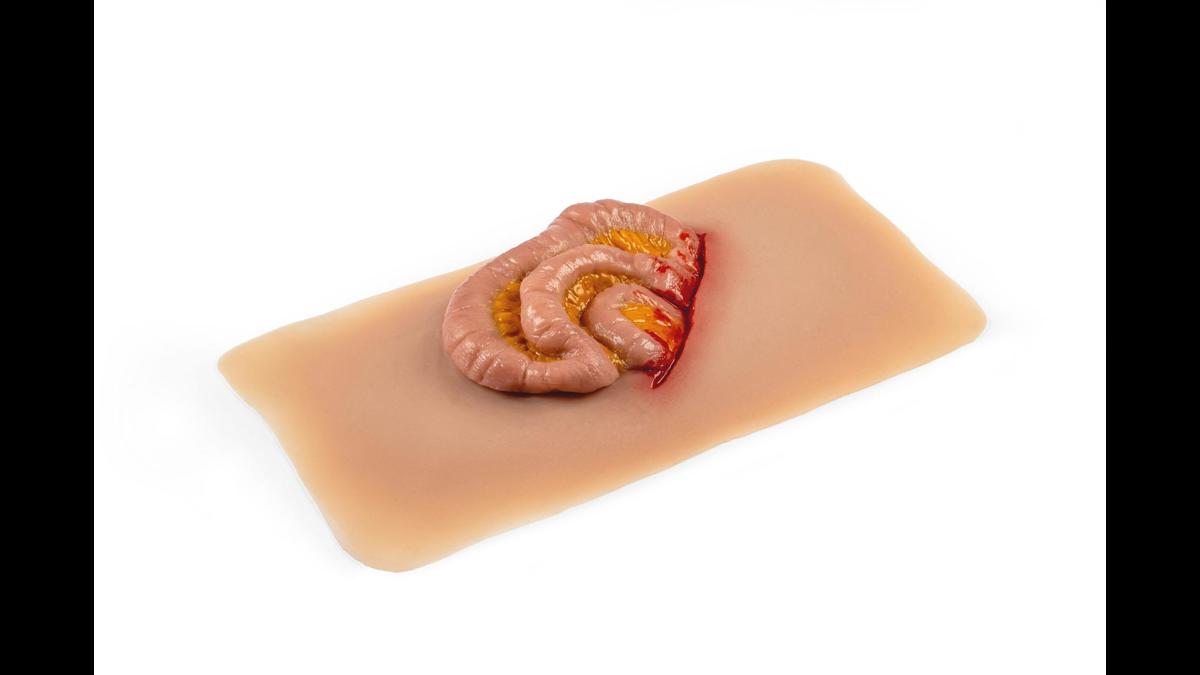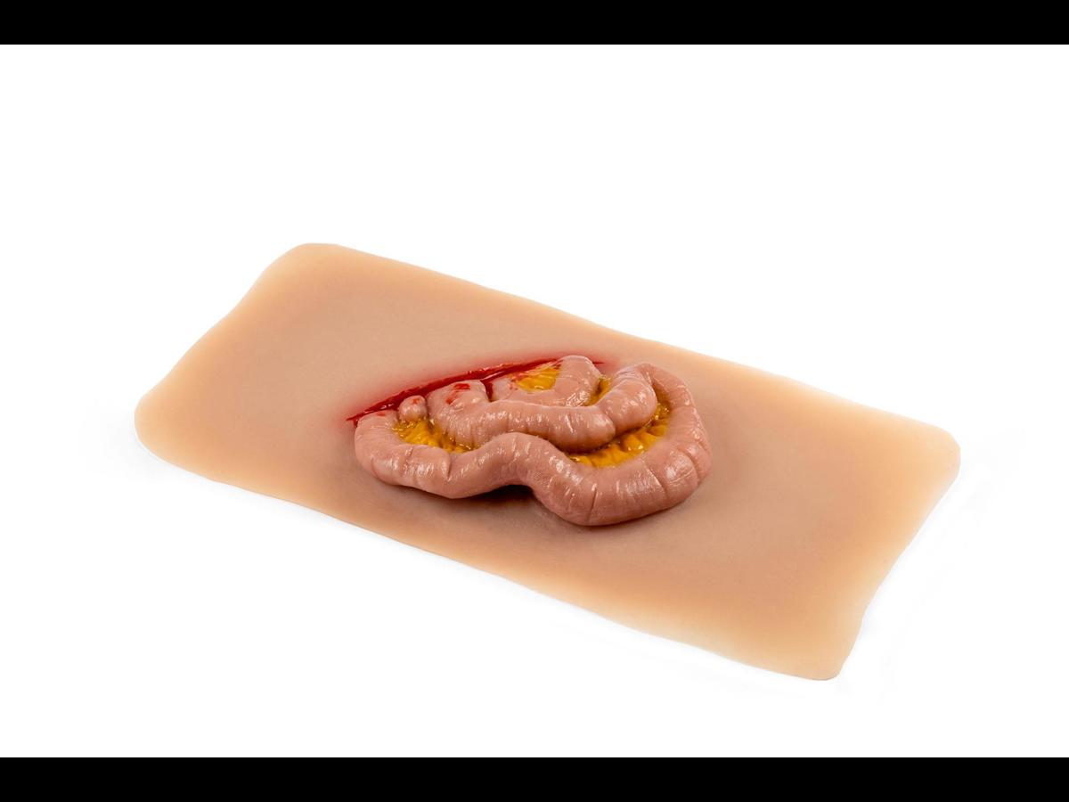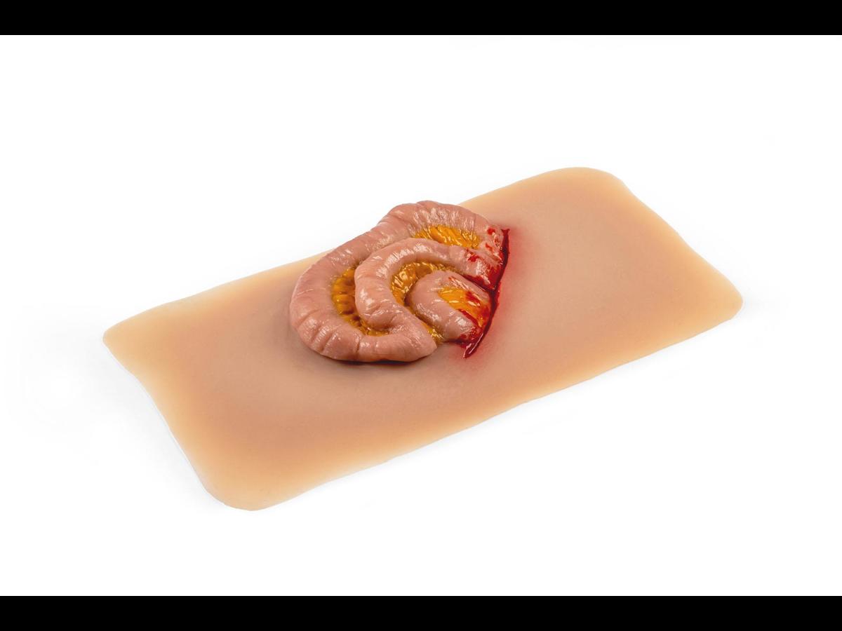 Realistiskt sårmoulage som visar evisceration av tunntarmen genom bukväggen; självhäftar på hud eller manikin (tillval: lim).