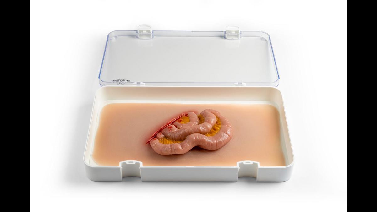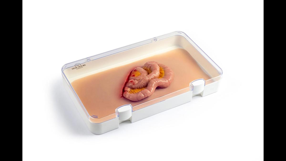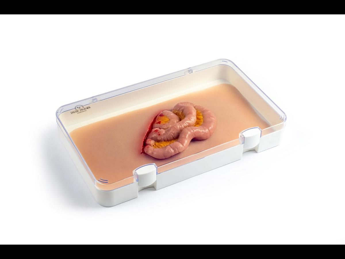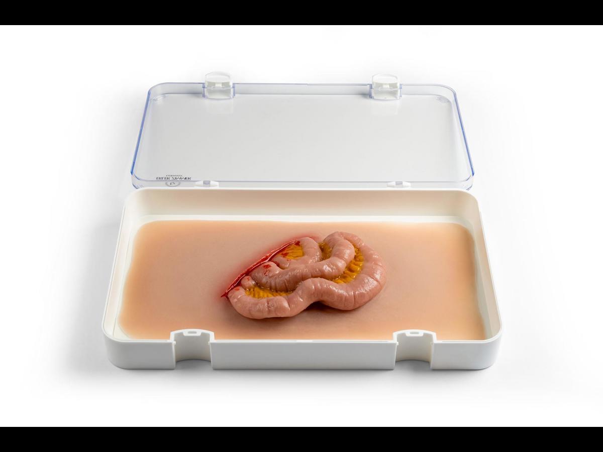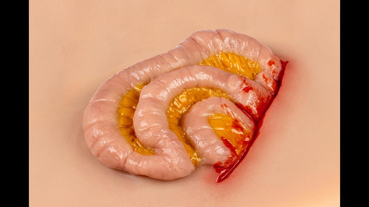 Realistiskt sårmoulage som visar evisceration av tunntarmen genom bukväggen; självhäftar på hud eller manikin (tillval: lim).