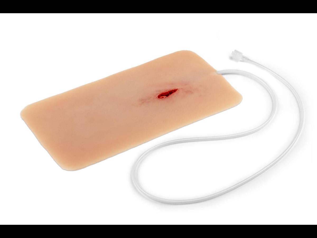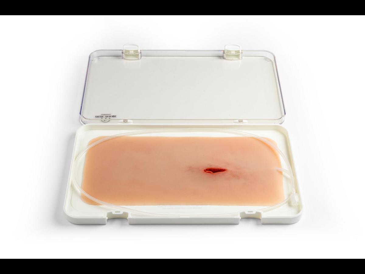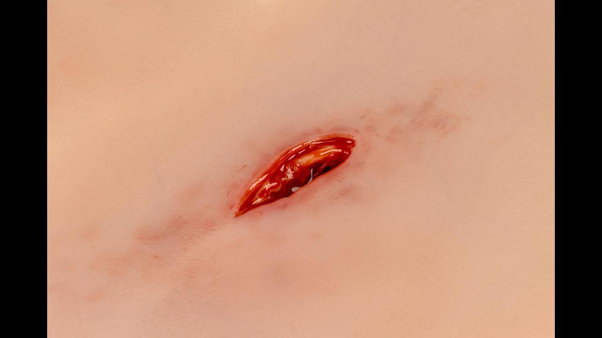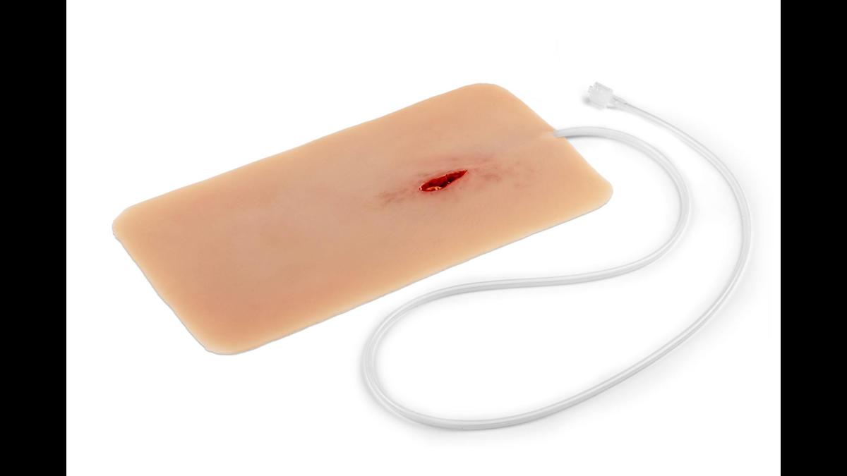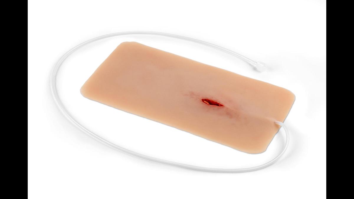 Realistiskt sticksårsmoulage med integrerad blödningsfunktion. Fästs direkt på hud eller träningsdocka; hudlim kan användas för längre pass.