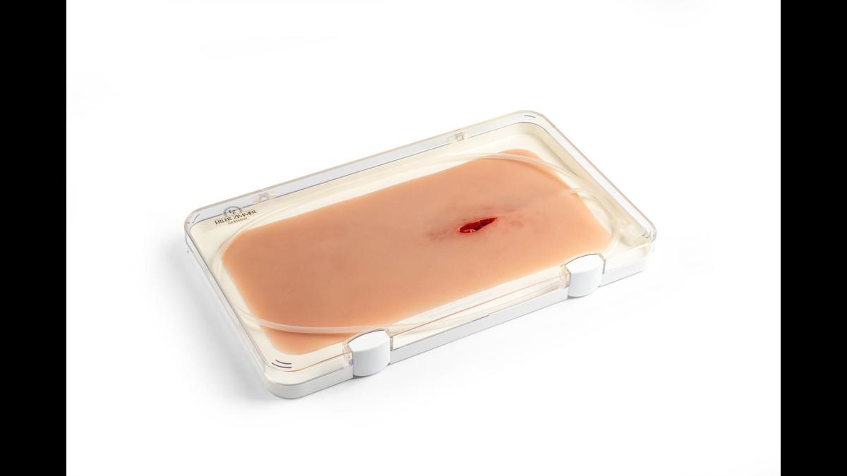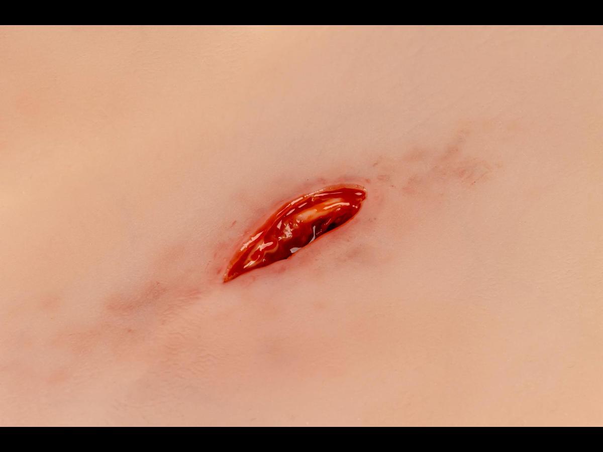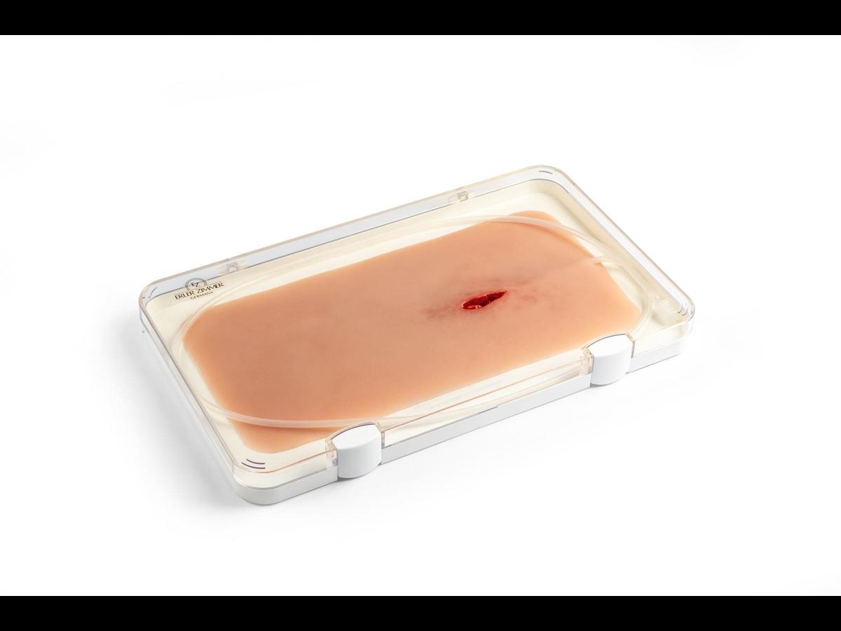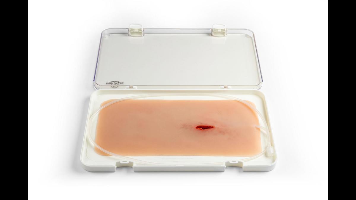 Realistiskt sticksårsmoulage med integrerad blödningsfunktion. Fästs direkt på hud eller träningsdocka; hudlim kan användas för längre pass.