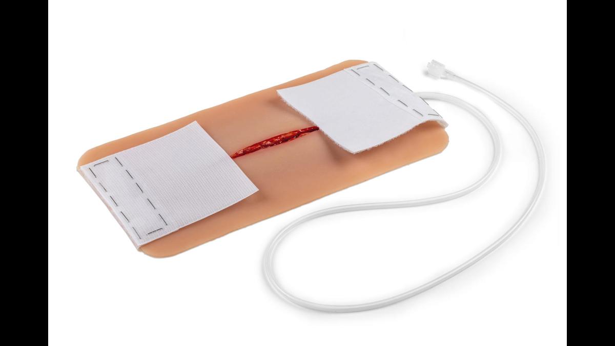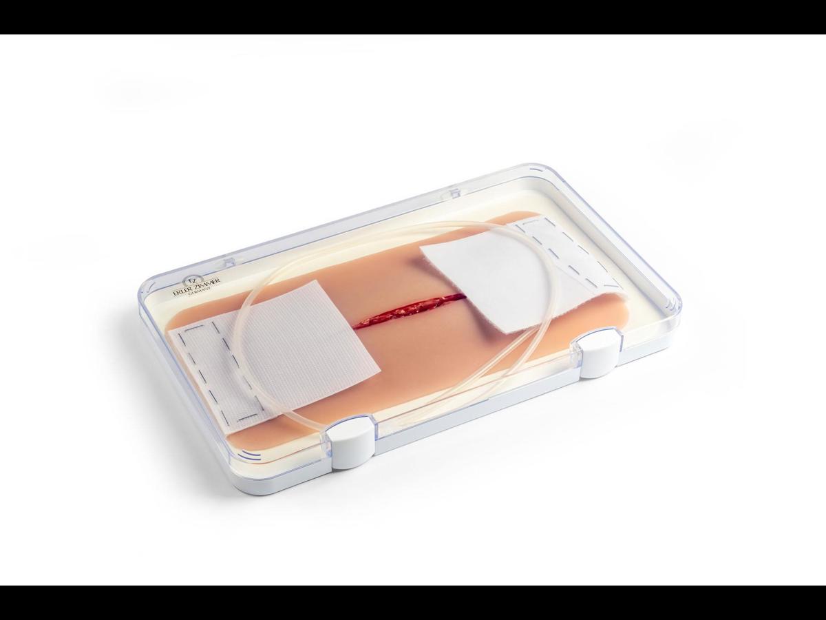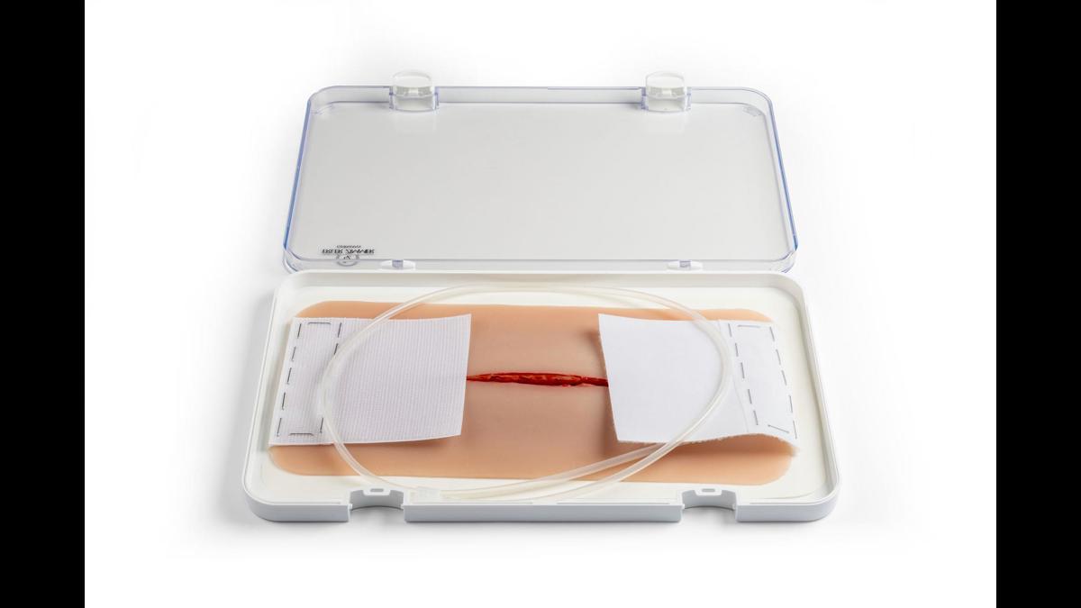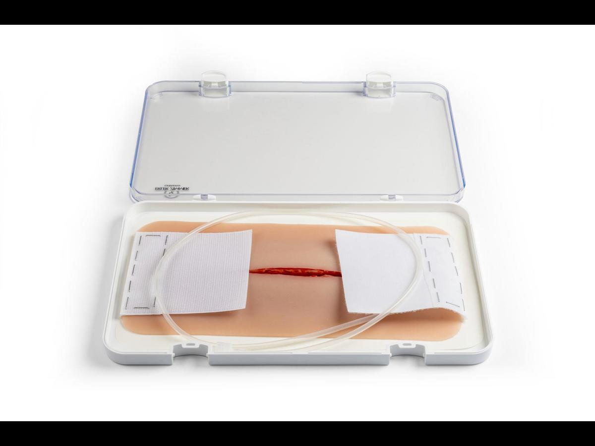 Detta realistiska halsmoulage visar ett snitt på halsen och är tillverkat i mjuk silikon för naturtrogen känsla och passform. Konstruktionen som en “krage” gör att den omsluter halsen och kan fixeras ytterligare i nacken med en kardborrefästning, vilket är praktiskt vid mer dynamiska scenarioträningar. Moulagen är självhäftande och kan appliceras direkt på både simulationsdockor och mänsklig hud (standardiserad patient); vid behov kan moulage‑lim användas för längre övningar, men observera att självhäftningen då permanent förloras. En integrerad försörjningsslang med koppling gör det möjligt att ansluta till ett blödningssystem för realistisk simulering av aktiv blödning, vilket stödjer träning i snabb bedömning, blödningskontroll och förbandsläggning vid hals-/struptrauma. Alla sår levereras i plastförvaringsbox för säker och hygienisk lagring mellan träningspass.