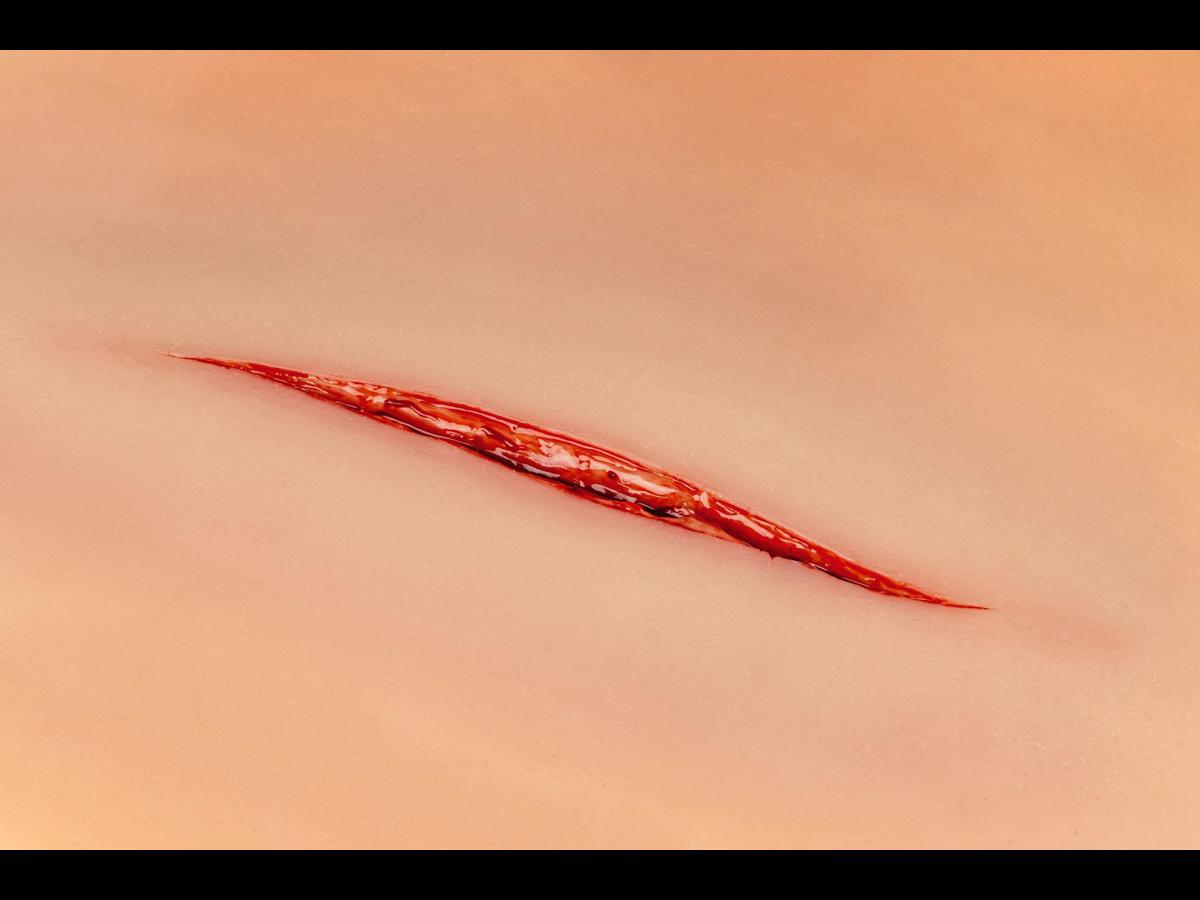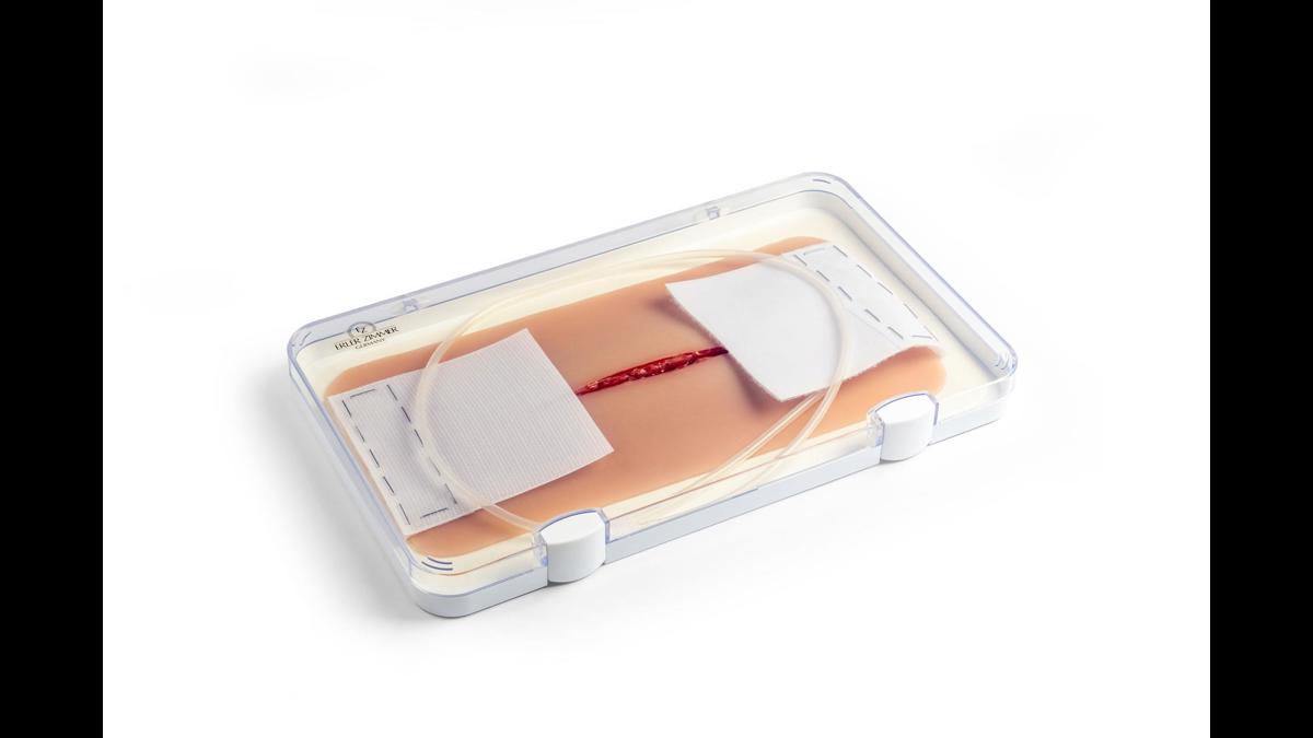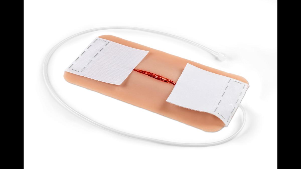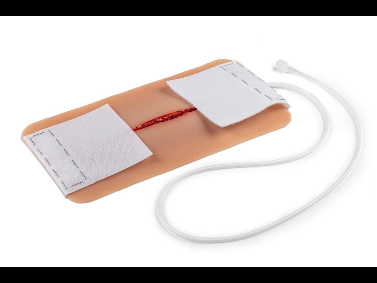 Detta realistiska halsmoulage visar ett snitt på halsen och är tillverkat i mjuk silikon för naturtrogen känsla och passform. Konstruktionen som en “krage” gör att den omsluter halsen och kan fixeras ytterligare i nacken med en kardborrefästning, vilket är praktiskt vid mer dynamiska scenarioträningar. Moulagen är självhäftande och kan appliceras direkt på både simulationsdockor och mänsklig hud (standardiserad patient); vid behov kan moulage‑lim användas för längre övningar, men observera att självhäftningen då permanent förloras. En integrerad försörjningsslang med koppling gör det möjligt att ansluta till ett blödningssystem för realistisk simulering av aktiv blödning, vilket stödjer träning i snabb bedömning, blödningskontroll och förbandsläggning vid hals-/struptrauma. Alla sår levereras i plastförvaringsbox för säker och hygienisk lagring mellan träningspass.