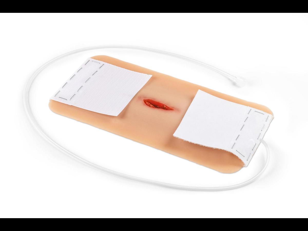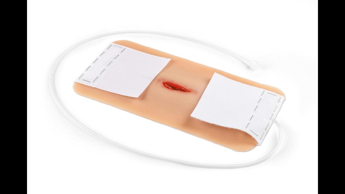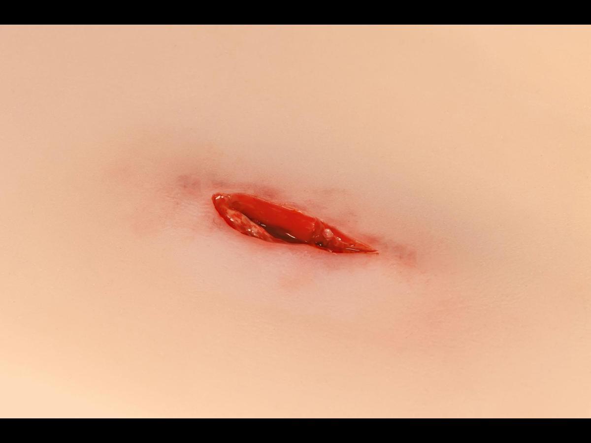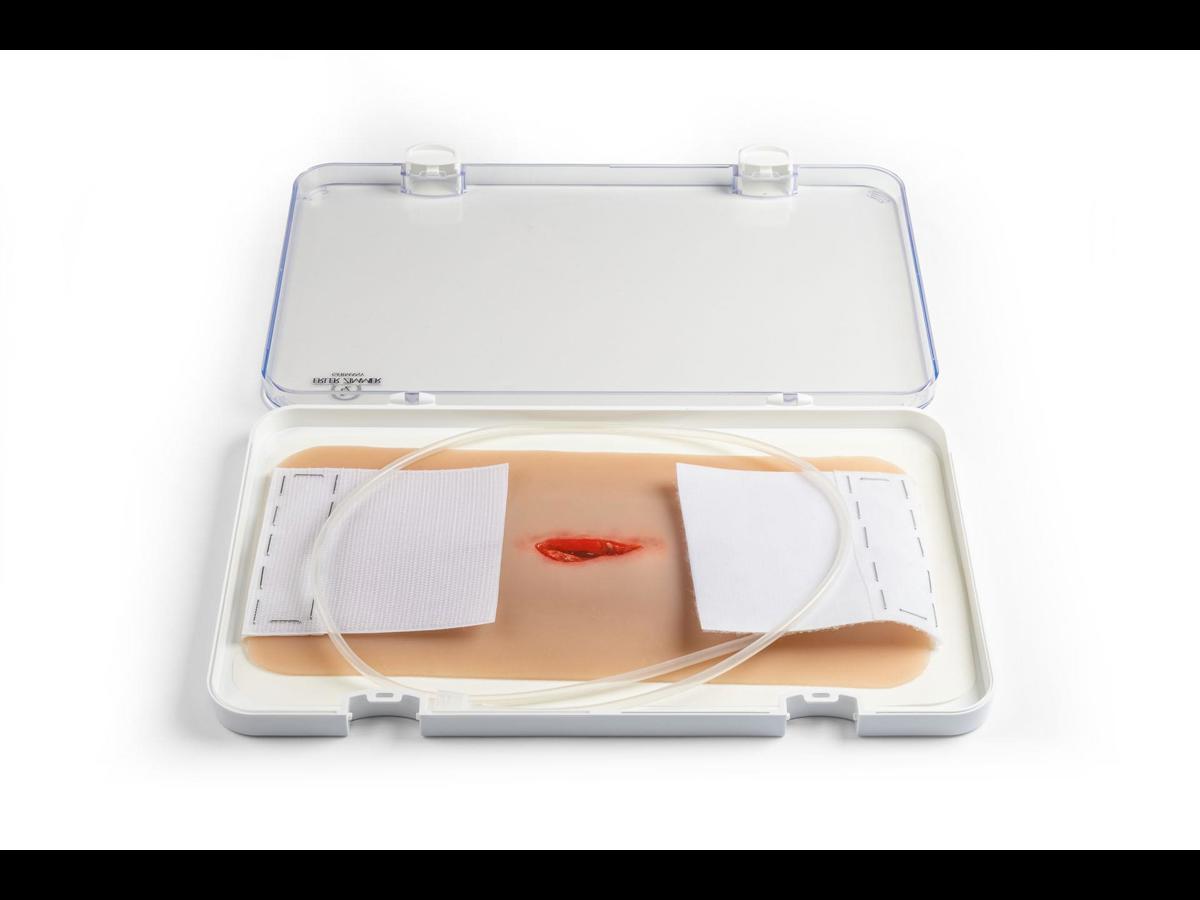 Detta realistiska hals-/nackmoulage visar ett penetrerande sticksår och är tillverkat i mjuk silikon för god passform och naturtroget utseende i simulationer. Kragekonstruktionen omsluter halsen och kan fixeras ytterligare med ett kardborrefäste i nacken, vilket ger stabilitet under mer rörliga övningar. Moulagen är självhäftande och kan appliceras direkt på både simulationsdockor och mänsklig hud (standardiserad patient). Den har en integrerad försörjningsslang med koppling till blödningssystem för realistisk simulering av aktiv blödning vid traumaträning, blödningskontroll och förbandsläggning. Vid behov kan moulage‑lim användas för längre träningspass; observera dock att den självhäftande egenskapen då permanent förloras. Alla sår levereras i plastlådor för säker förvaring och transport mellan övningar.