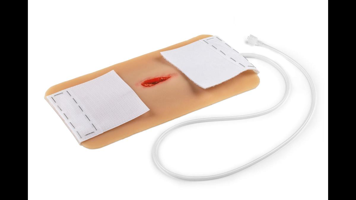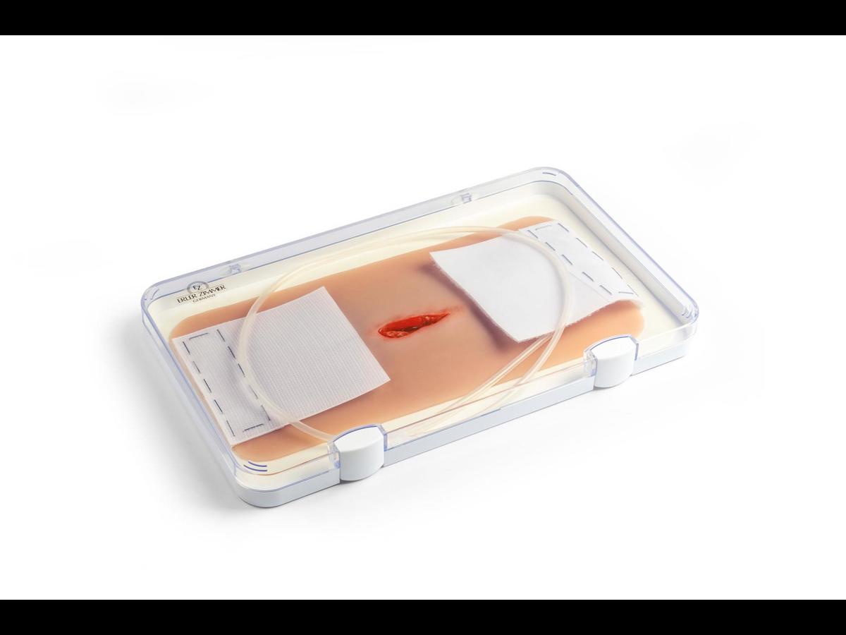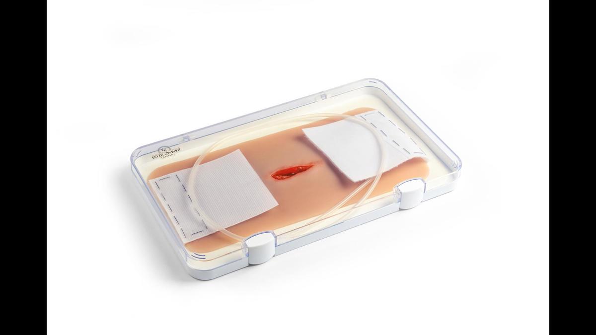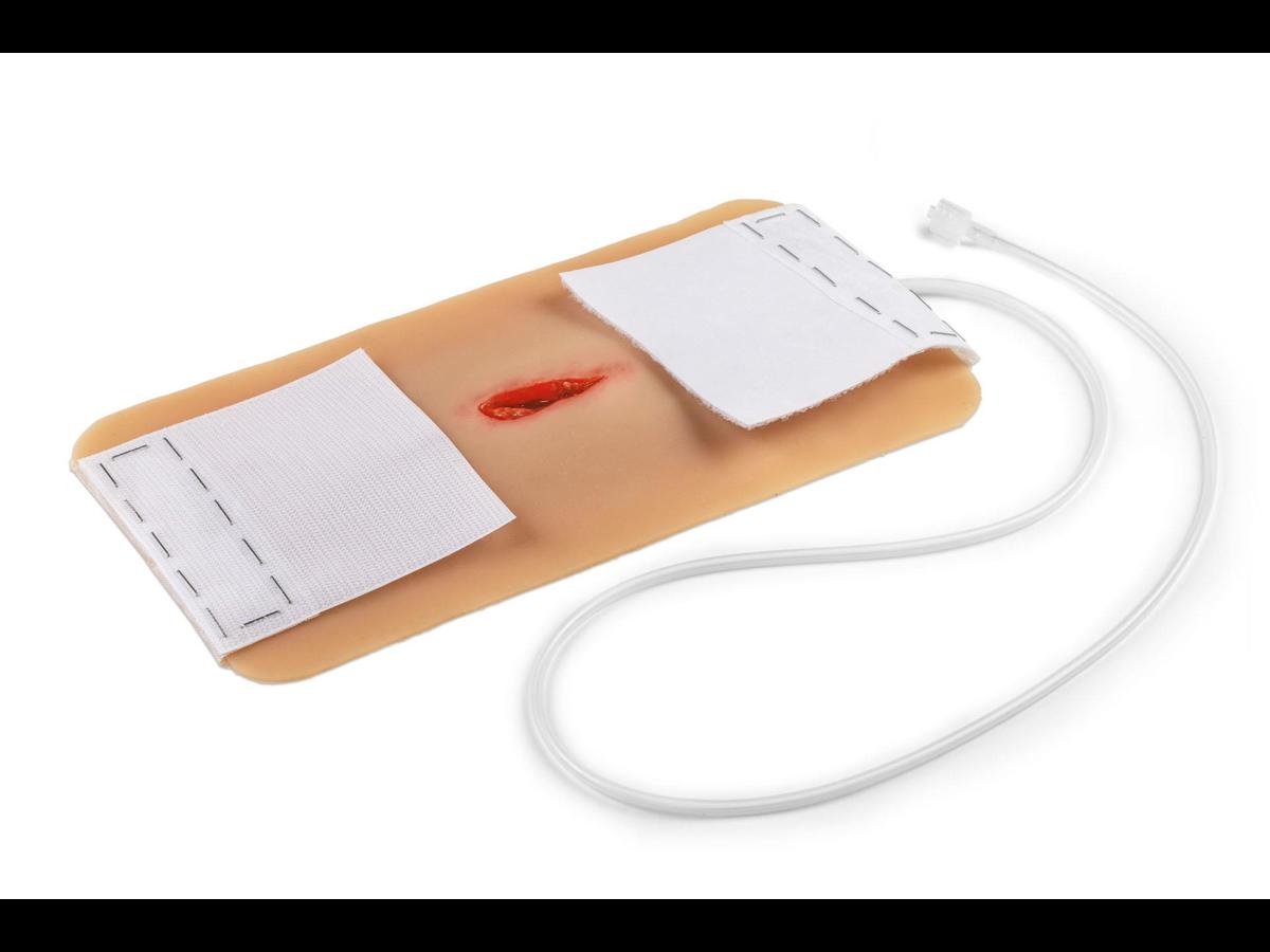 Detta realistiska hals-/nackmoulage visar ett penetrerande sticksår och är tillverkat i mjuk silikon för god passform och naturtroget utseende i simulationer. Kragekonstruktionen omsluter halsen och kan fixeras ytterligare med ett kardborrefäste i nacken, vilket ger stabilitet under mer rörliga övningar. Moulagen är självhäftande och kan appliceras direkt på både simulationsdockor och mänsklig hud (standardiserad patient). Den har en integrerad försörjningsslang med koppling till blödningssystem för realistisk simulering av aktiv blödning vid traumaträning, blödningskontroll och förbandsläggning. Vid behov kan moulage‑lim användas för längre träningspass; observera dock att den självhäftande egenskapen då permanent förloras. Alla sår levereras i plastlådor för säker förvaring och transport mellan övningar.