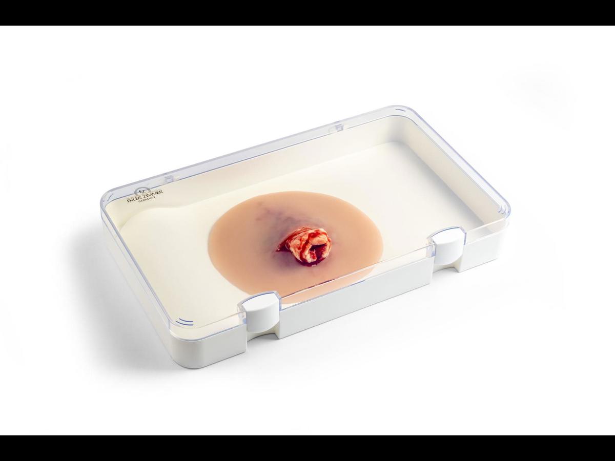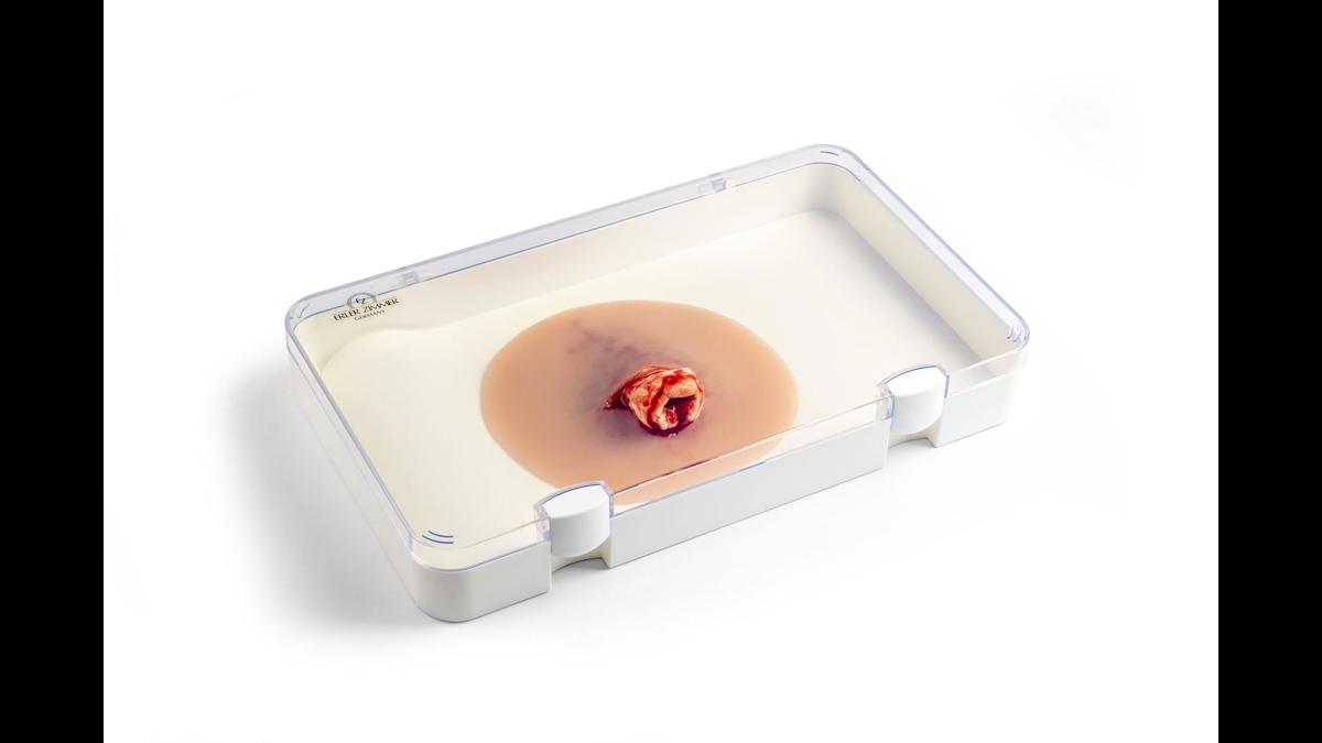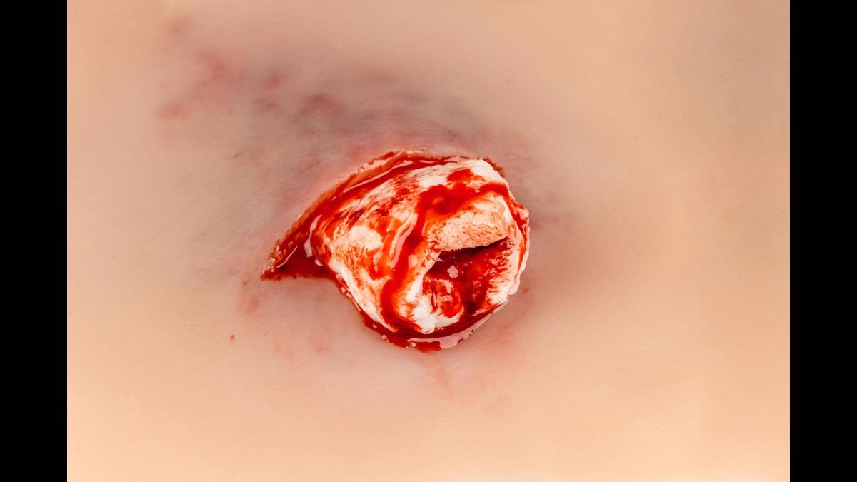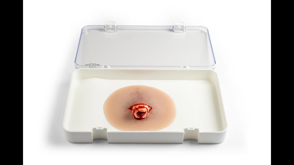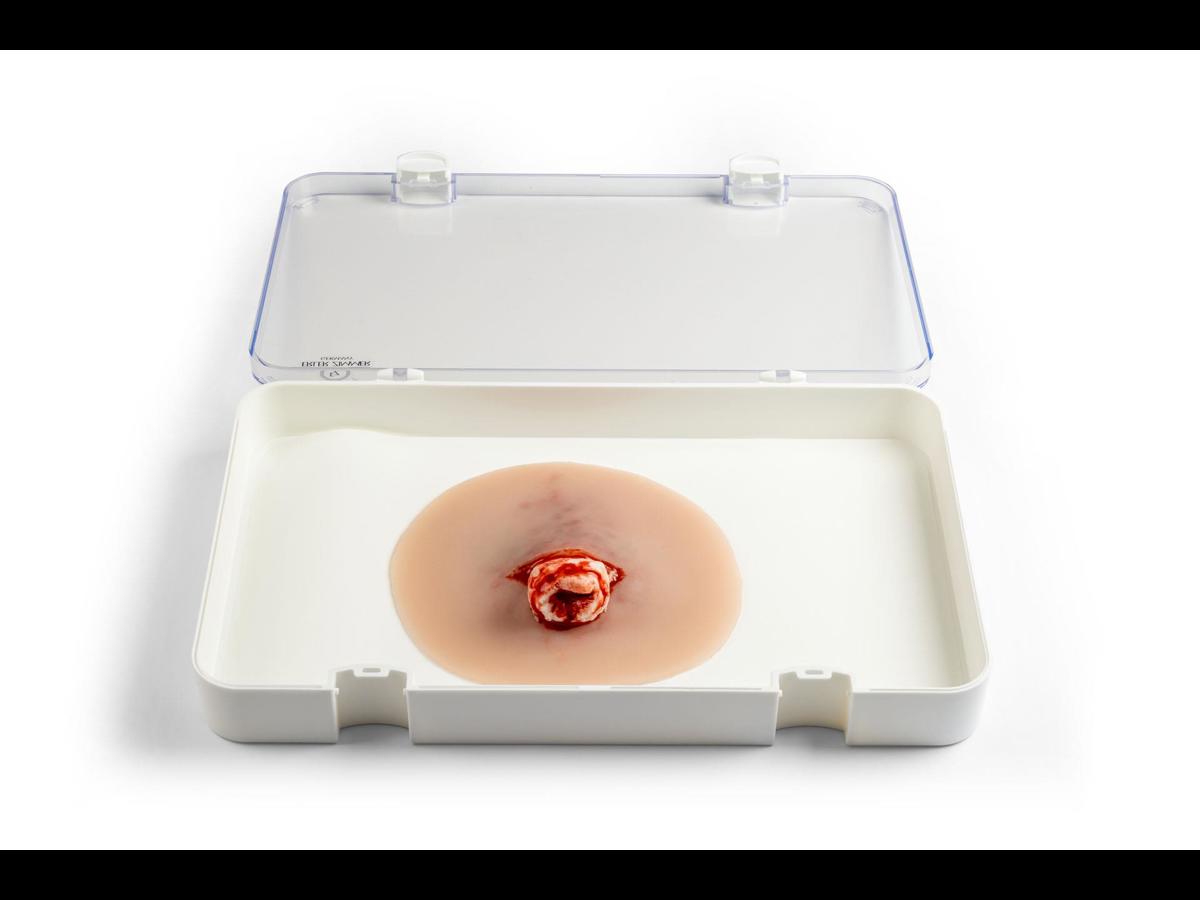 Wound presentation “Open fracture ankle joint” är ett detaljerat silikonmoulage designat för traumaträning vid fotledsfrakturer. Den yttre delen är gjord av mjuk silikon för realistisk känsla mot hud och vävnad, medan det exponerade benfragmentet är tillverkat av hårdare silikon för att tydligt efterlikna benstruktur utan att riskera skada under övning. Moulagen är självhäftande och kan fästa direkt på både manikiner och människohud (standardiserade patienter). För längre träningspass eller vid behov av starkare fäste kan ett särskilt moulage‑lim användas; tänk dock på att limmet permanent förstör den självhäftande ytan. Ett praktiskt och hållbart hjälpmedel för realistiska akutscenarier inom akutsjukvård, prehospital träning och medicinska utbildningar.