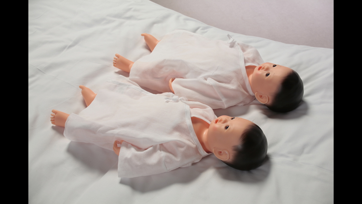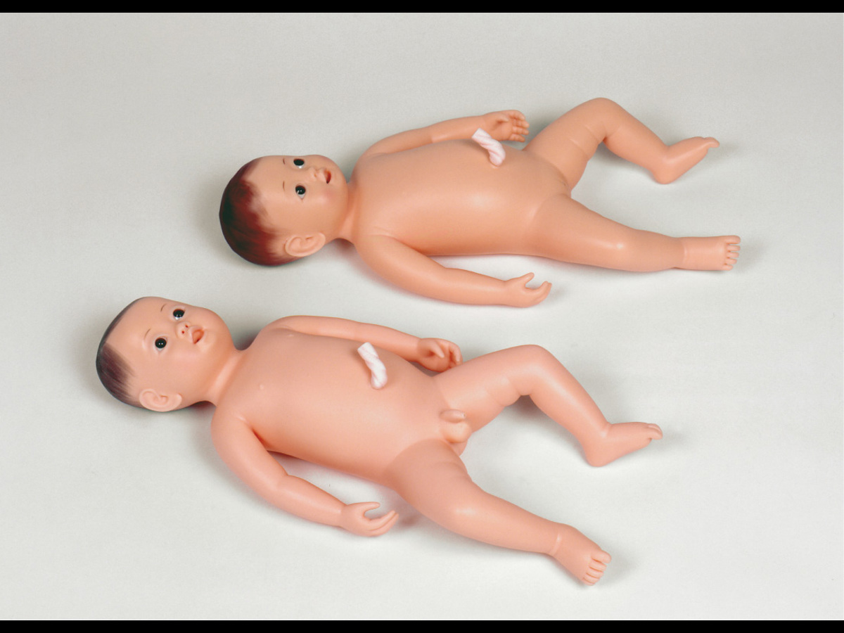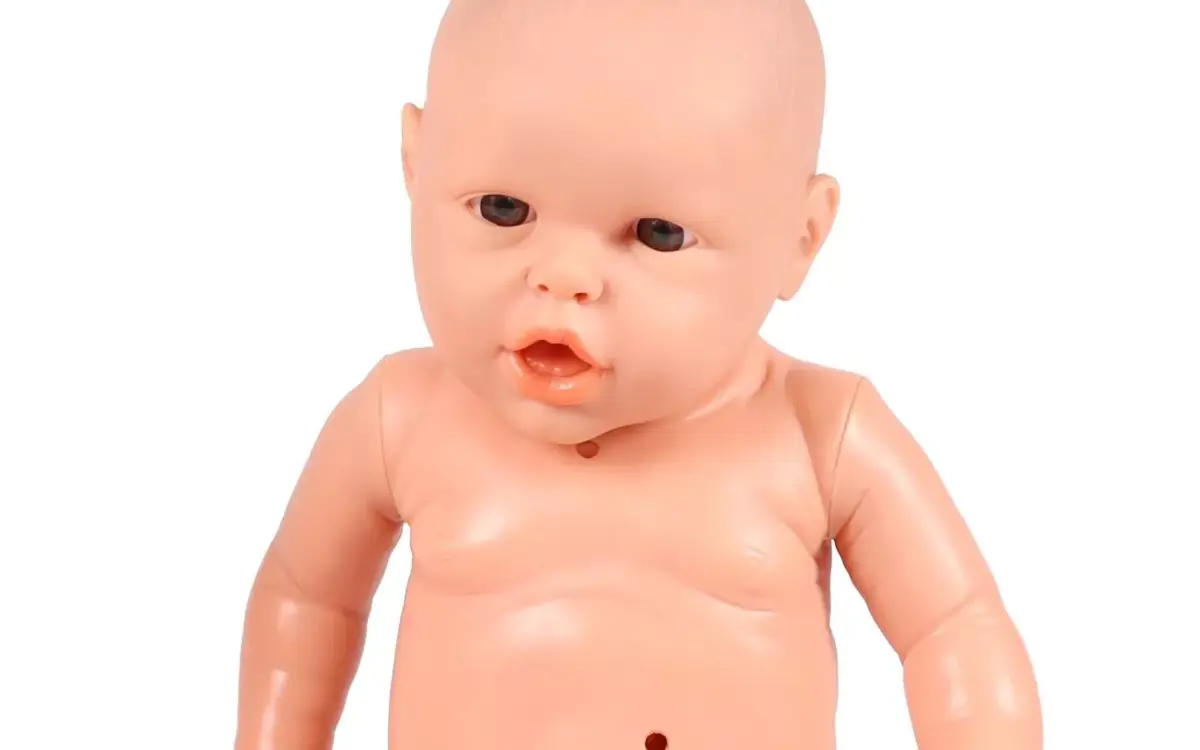 This model is a life-size manikin for a 0-4 week old infant that replicate the weight and anatomy of a newborn with palpable fontanels.