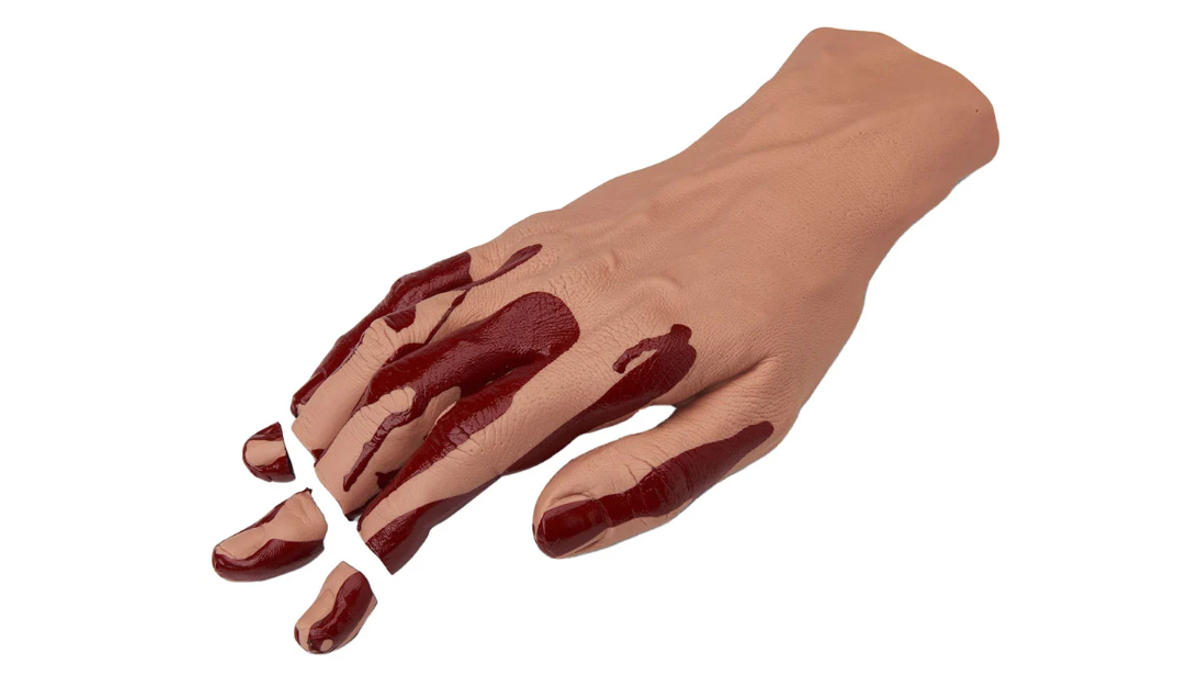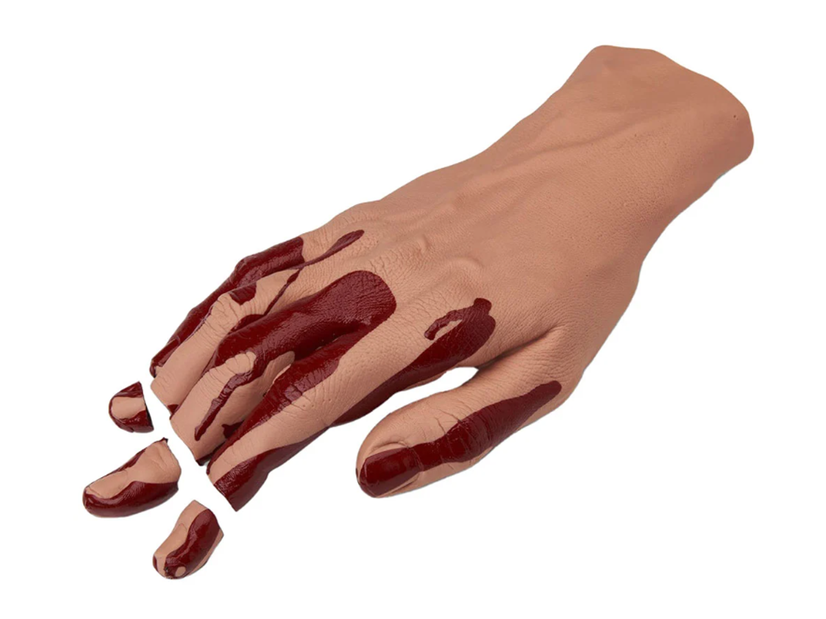 This simulated hand has 3 severed fingers and is suitable for use with manikins and moulage makeup.
