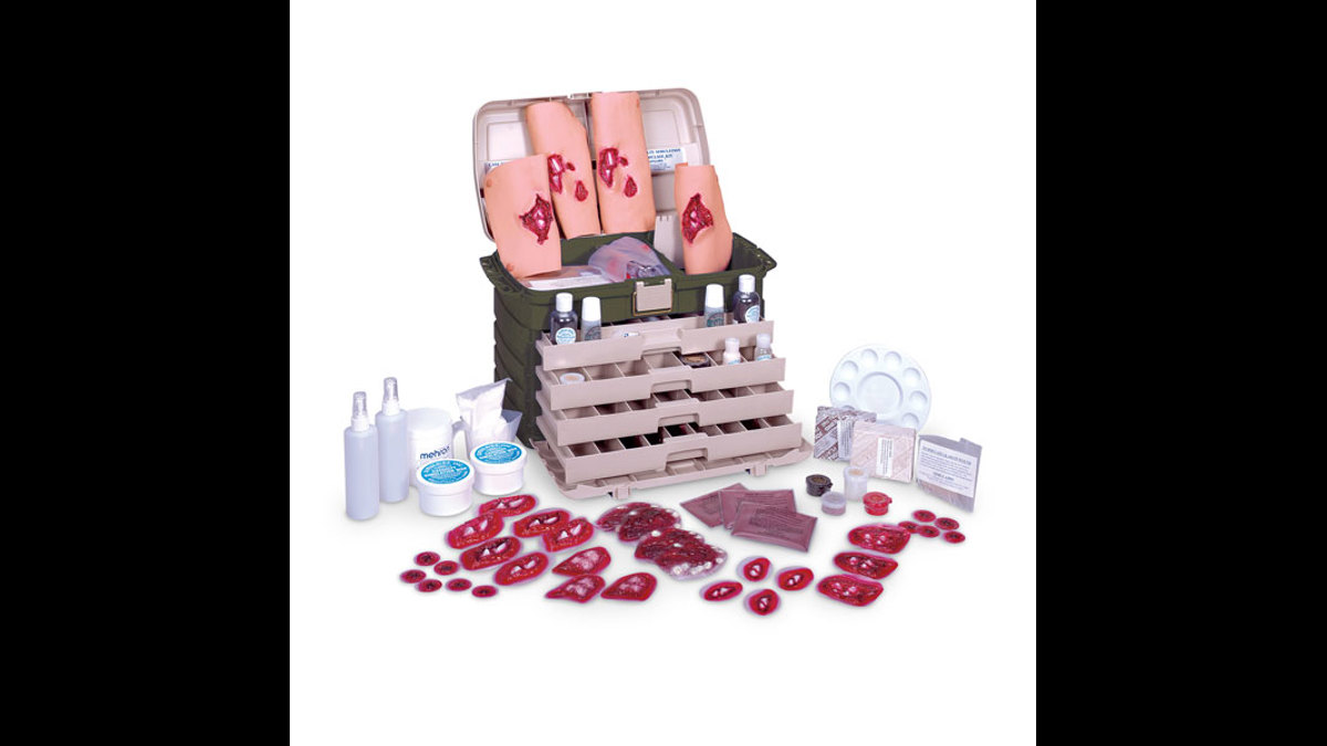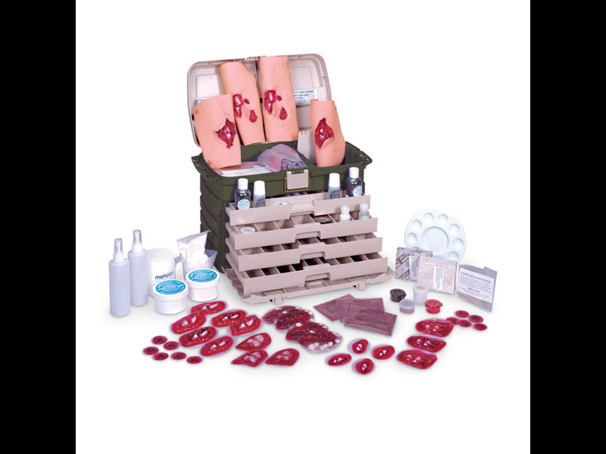 Det här kittet kan användas för att simulera olyckor. Innehåller sår som efterliknar skottskador och sakdor med synliga benfragment.
