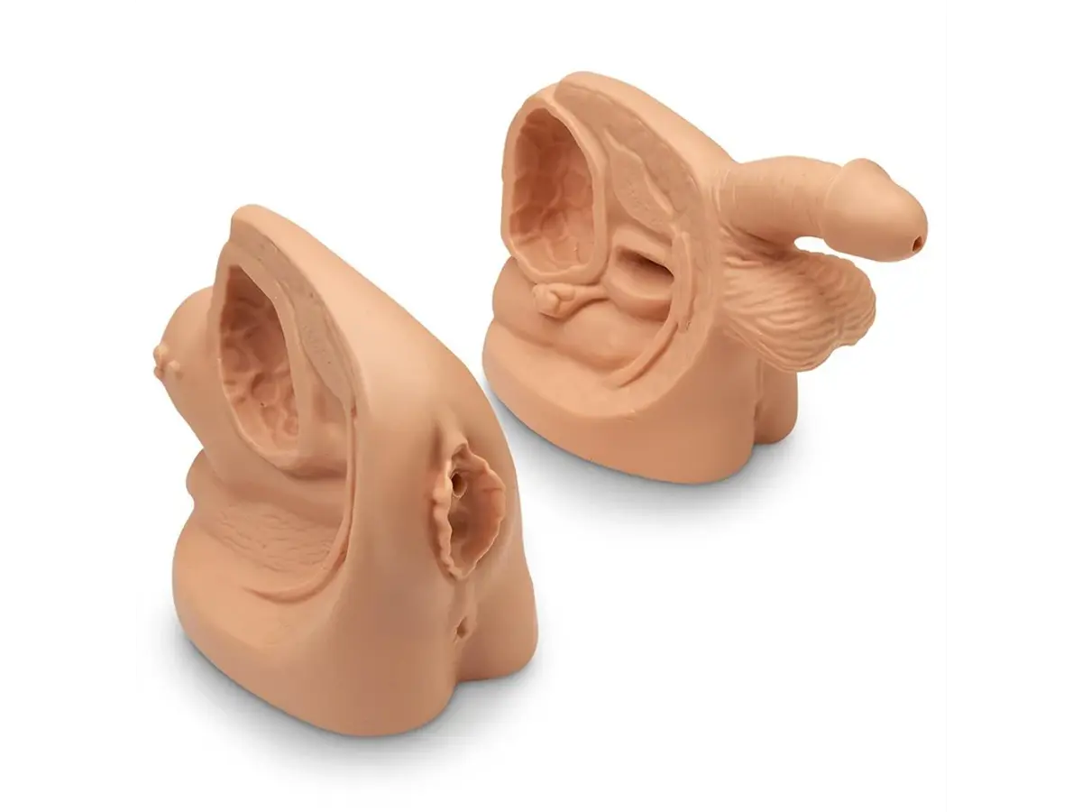 Den manliga modellen visar anatomiska strukturer som ändtarm, sädesblåsa, urinblåsa, bäckenben, prostata, urinrörssfinkter, urinrörsöppning, ollon, pung, bäckendiaphragma och anus. Den kvinnliga modellen illustrerar ändtarm, livmoder, urinblåsa, bäckenben, urinrörssfinkter, klitoris, urinrörsöppning, inre och yttre blygdläppar, vagina, bäckendiaphragma och anus.