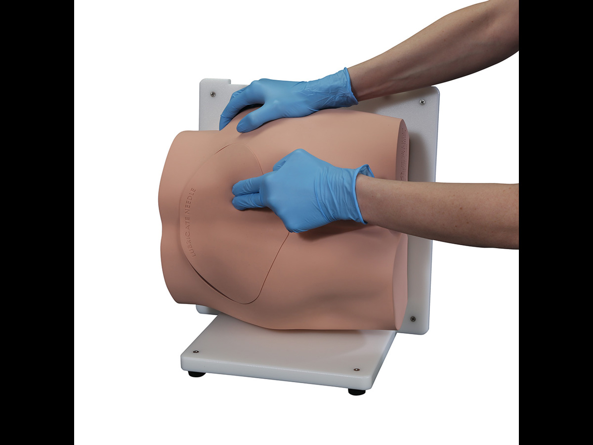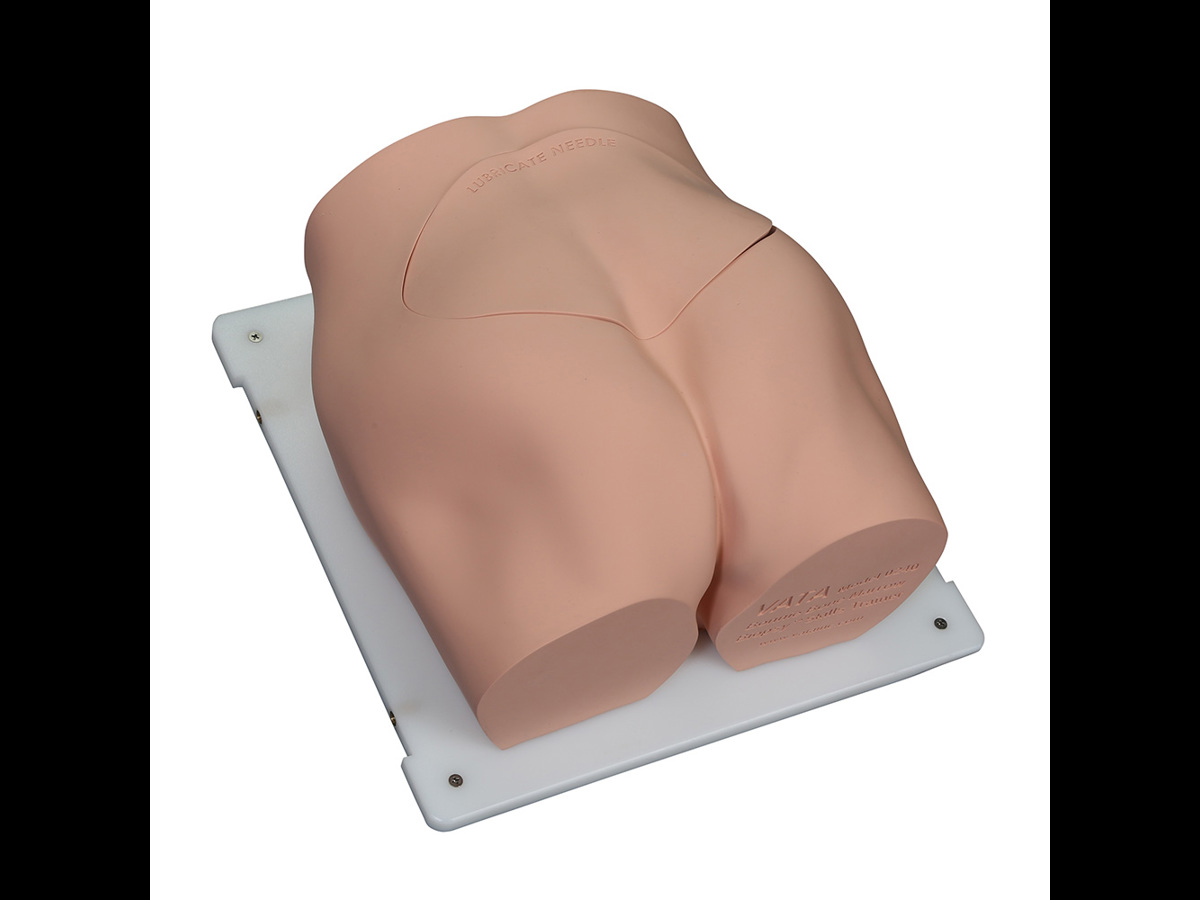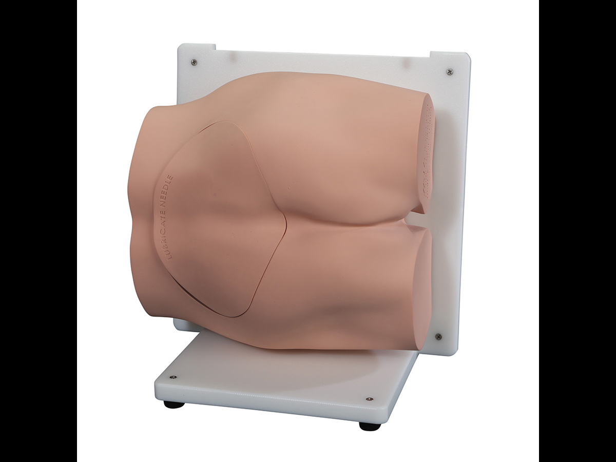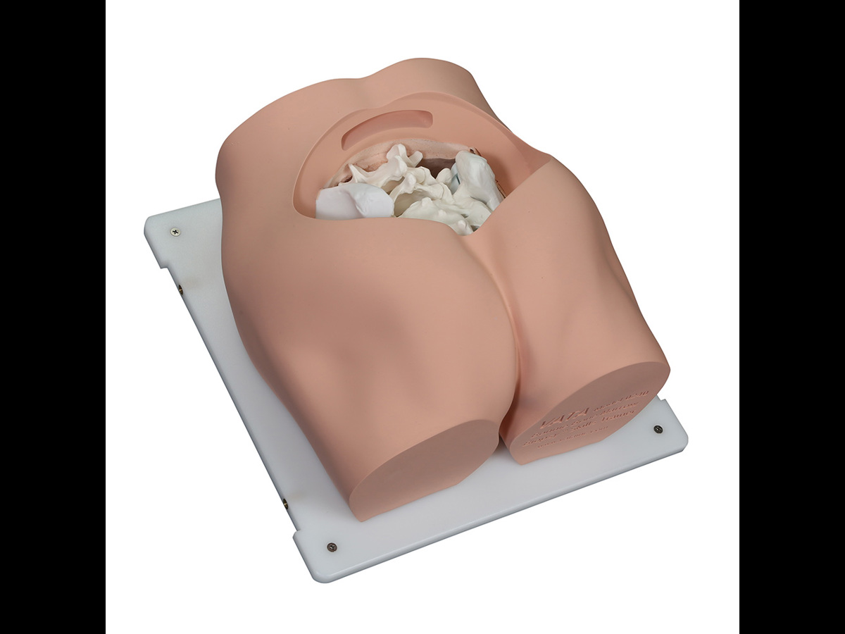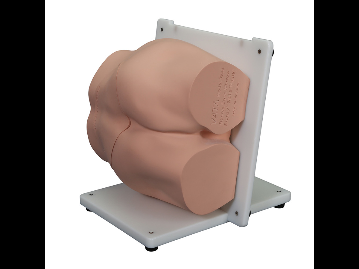 En realistisk modell, designad med hjälp av läkare, för övning av benmärgsbiopsi på baksidan av höftbenet.