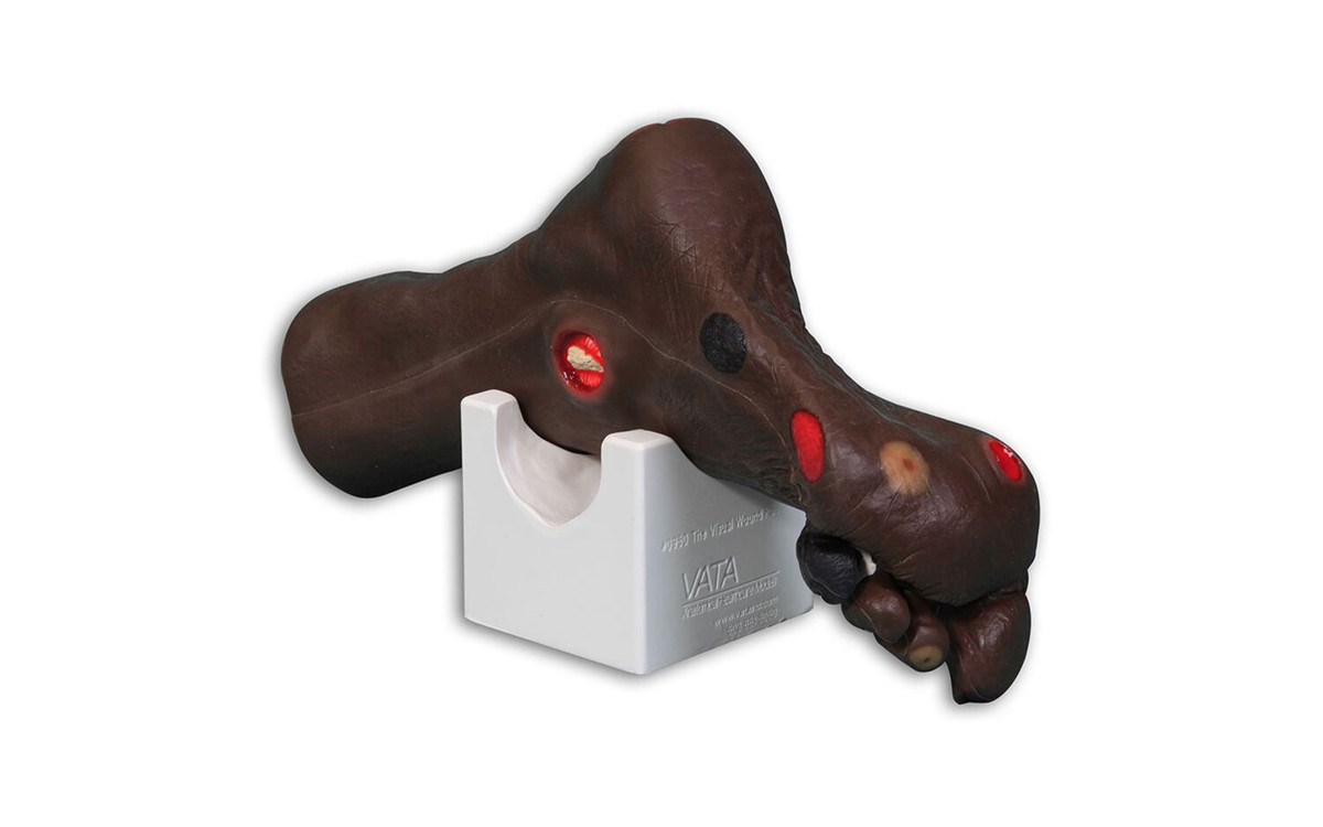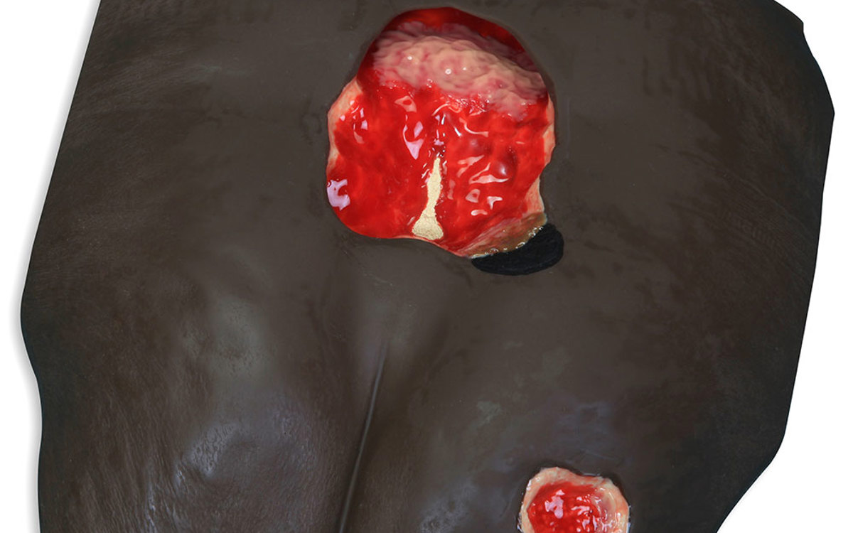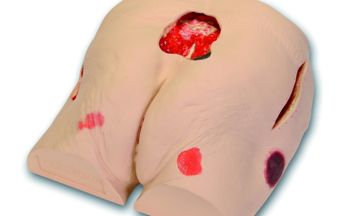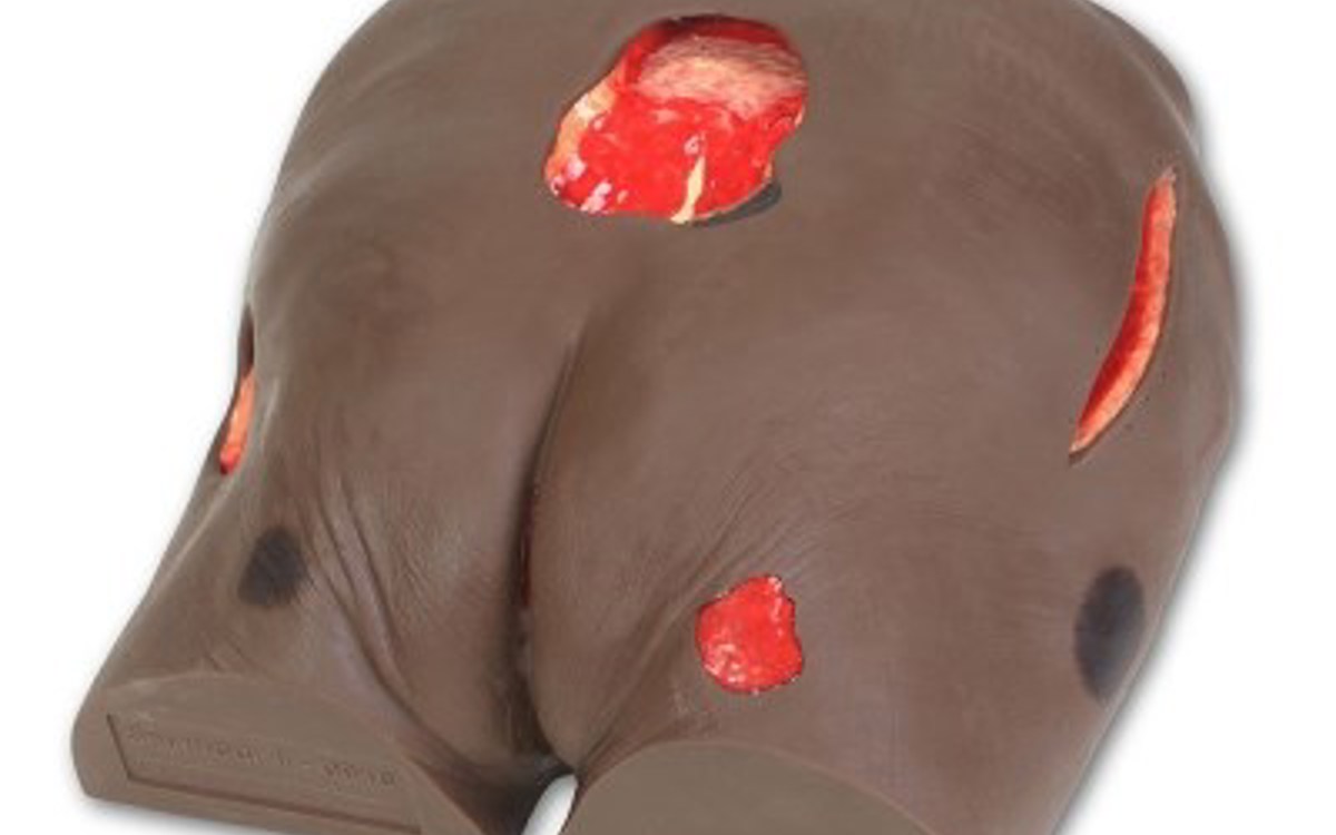 En realistisk modell, designad med hjälp av läkare, för övning av benmärgsbiopsi på baksidan av höftbenet.